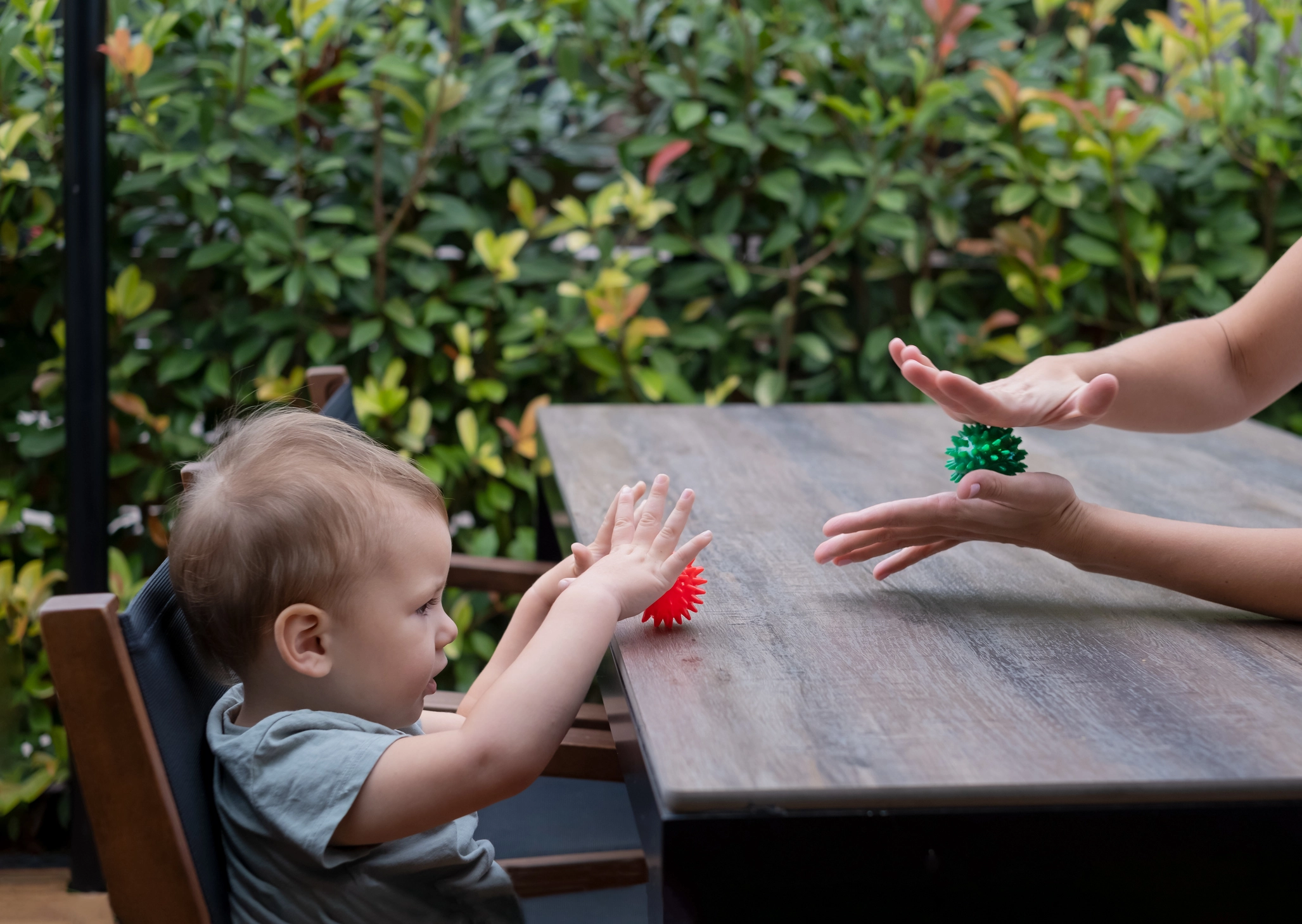 Упражнение 1. Дайте ребенку массажный гелевый мячик. Предложите ему покатать его по полу, будто это машинка, построив сложный маршрут. На некоторых поворотах подскажите менять руки.