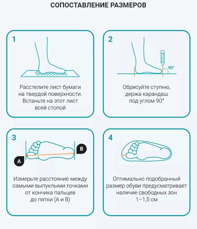 Чтобы правильно выбрать размер при покупке ортопедической обуви, нужно заранее измерить стопы. Для этого рекомендуется: