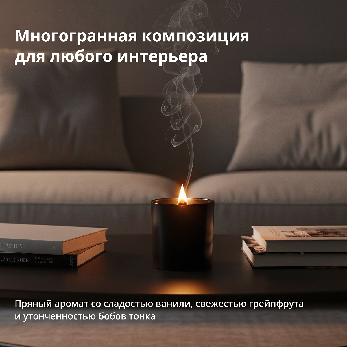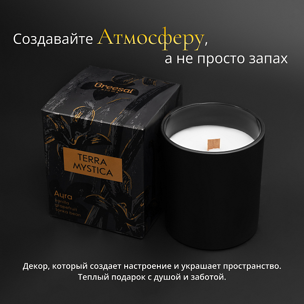 Ароматическая свеча Breesal Terra Mystica наполняет пространство сочным цитрусовым стартом и мягким гурманским теплом: яркий грейпфрут задает бодрую искру с деликатной кислинкой, моментально освежает и «осветляет» атмосферу; благородные бобы тонка раскрываются бархатистой сладостью с миндально‑пряным нюансом, добавляют глубину и обволакивающий комфорт; ваниль соединяет композицию в кремовый шлейф без излишней резкости, делает звучание мягким, теплым и особенно уютным в вечерние часы. Лаконичный черный стакан со стильной крышкой гармонично вписывается в современный интерьер и уместен в роли универсального подарка.