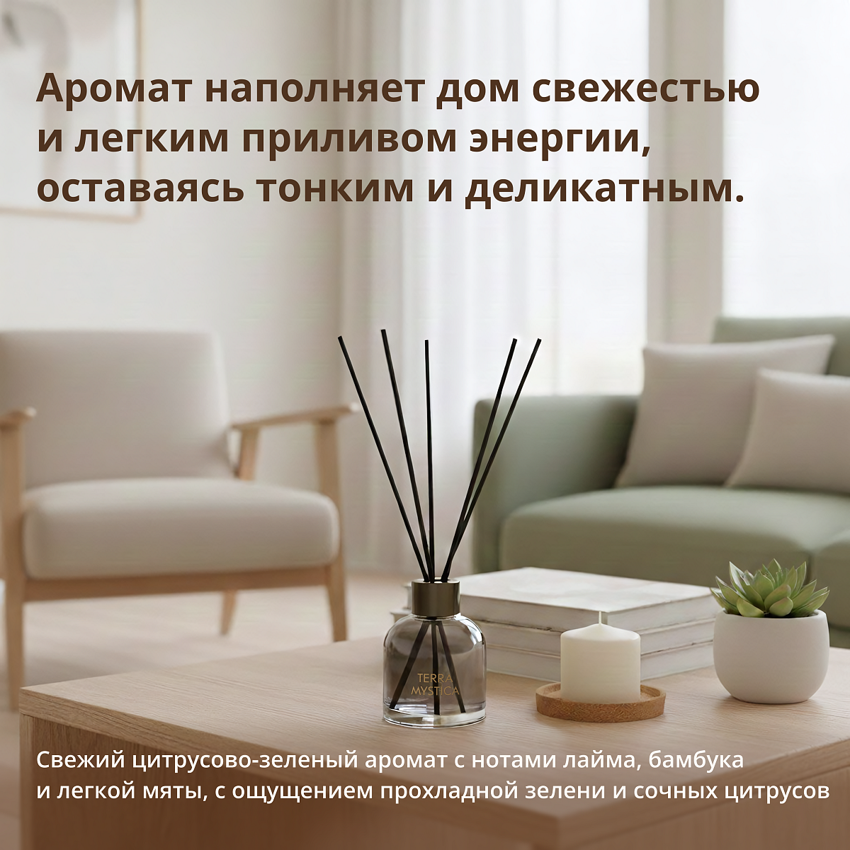 Breesal Terra Mystica «Бамбук, лайм, мята» — свежий и динамичный аромат для дома. Бамбук в интерьерном аромадиффузоре звучит зелено и чисто, наполняет комнату ощущением прохлады и естественной легкости. Лайм добавляет яркую цитрусовую искру с деликатной кислинкой, придает бодрость и «осветляет» интерьер. Мята вносит прохладный ментоловый штрих без лишней резкости, выравнивает композицию и делает ее воздушной. Такой профиль отлично вписывается в гостиную и кухню‑столовую для ощущения свежести, уместен в кабинете для концентрации, в прихожей создает чистый и приветливый фон с первых секунд.