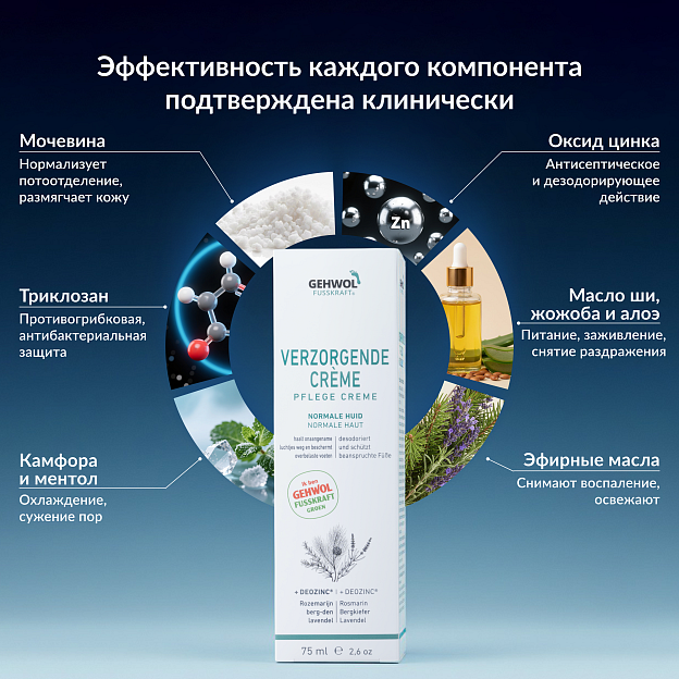 Зеленый бальзам для ног Gehwol Fusskraft эффективно регулирует потоотделение и нейтрализует микробную активность, обеспечивая ногам ощущение свежести и устраняя неприятные запахи. Антисептические компоненты защищают кожу от грибковых поражений и ощущения дискомфорта между пальцами ног. Формула обогащена натуральными эфирными маслами розмарина, лаванды и горной сосны, а также камфорой и ментолом.