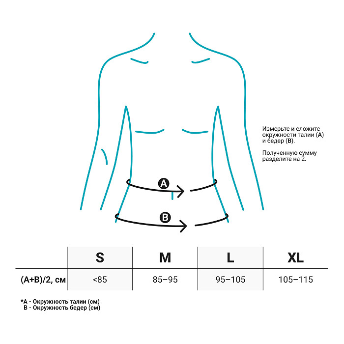 Для правильного выбора подходящего размера пахового бандажа Orlett HB-484 необходимо сантиметровой лентой измерить окружность талии и бедер. Далее сумму окружностей поделить пополам и воспользоваться таблицей.