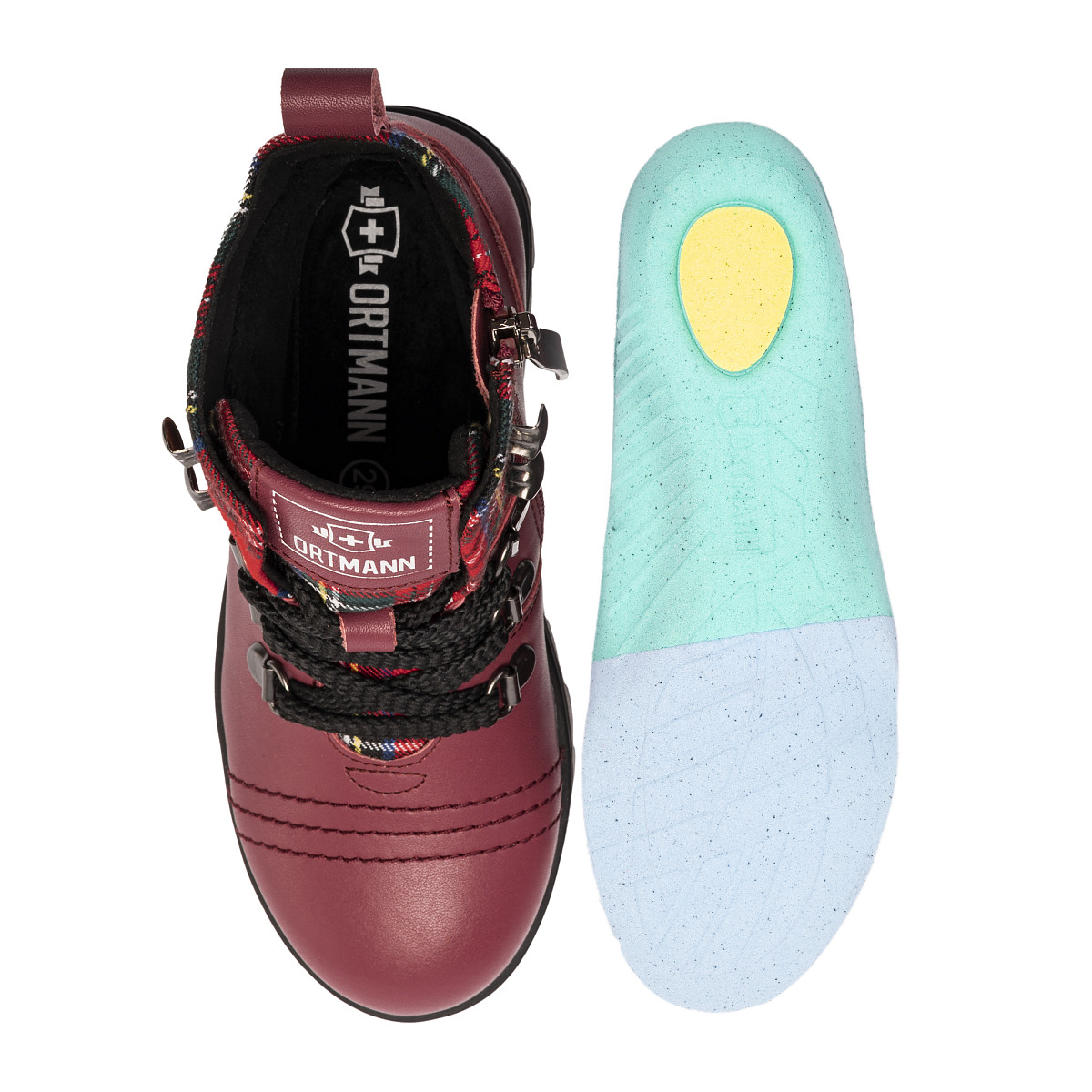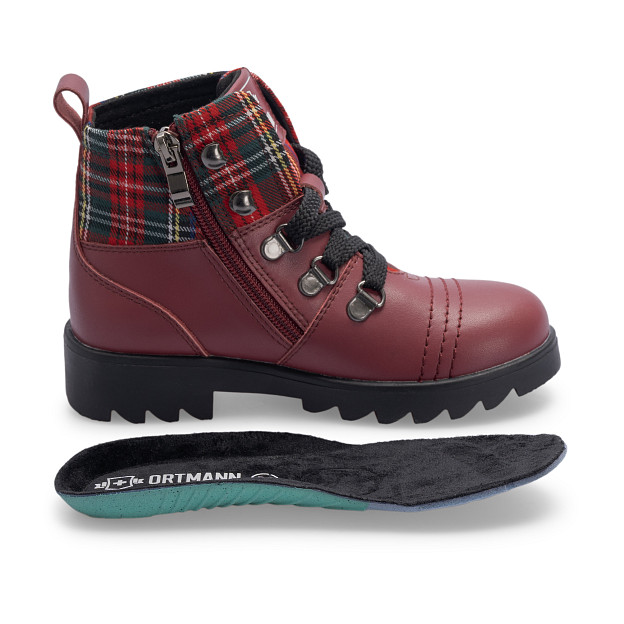 Детские ортопедические ботинки ORTMANN Aurel из натуральной кожи с принтом в шотландскую клетку. Съемная ортопедическая стелька смягчает ударную нагрузку на суставы ног. Берцы ORTMANN произведены на ортопедической колодке и имеют анатомически правильную форму, обеспечивающую с наружной и внутренней стороны корректную фиксацию, а также способствуют предотвращению дальнейшей деформации голеностопного сустава.