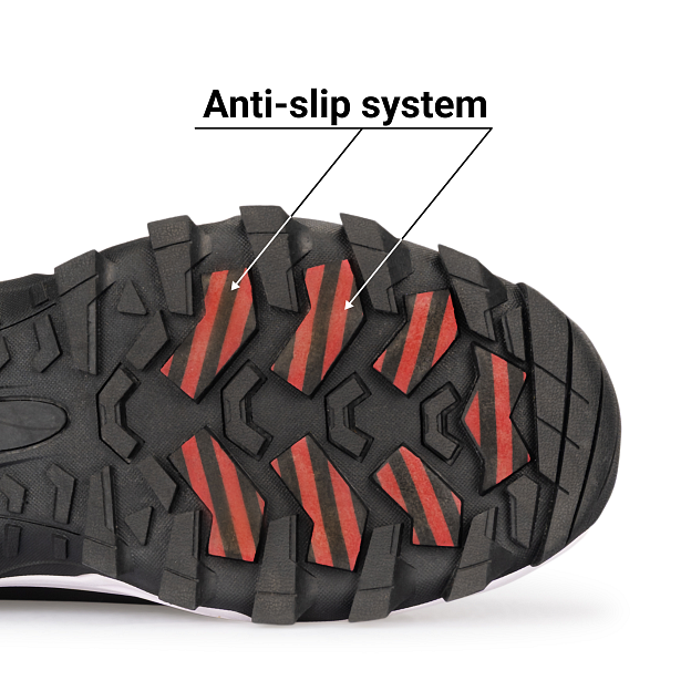 Подошва зимних ботинок оснащена системой против скольжения Anti-slip со встроенными композитными элементами, которые гарантируют уверенное сцепление даже с обледенелой поверхностью. Внутри предусмотрены откидные шипы, которые легко активировать при гололеде и убрать при ходьбе по нескользкому покрытию. Такое сочетание технологий делает обувь максимально безопасной и устойчивой на любом зимнем рельефе, обеспечивая комфорт и надежность в движении.
