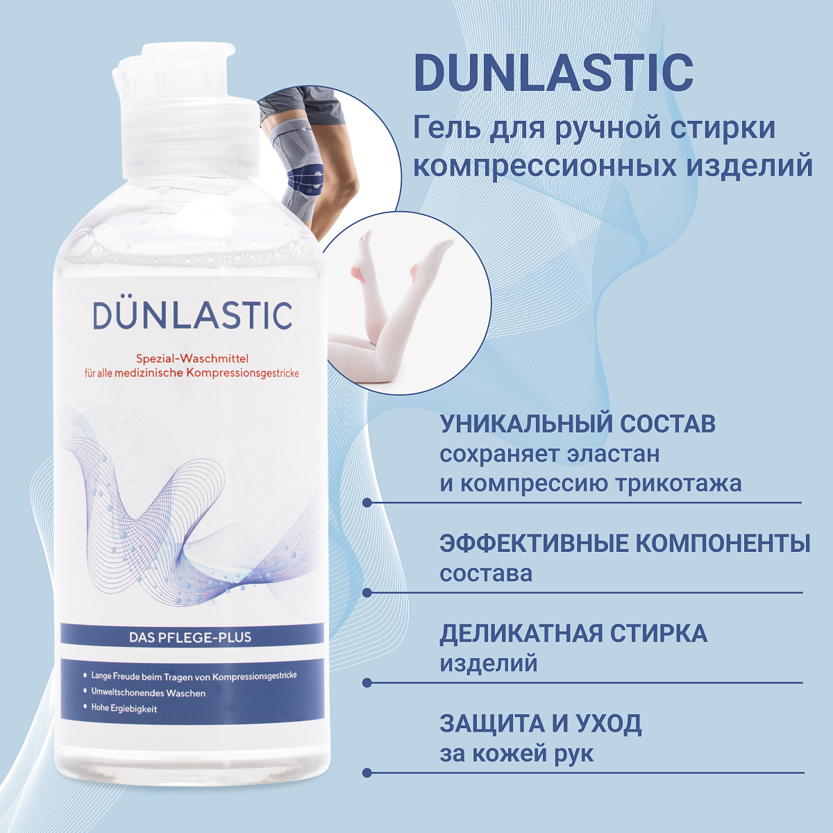 С учётом высокой стоимости компрессионных медицинских изделий, для ухода за ними требуется специальное моющее средство, которое не повреждает структуру эластичных волокон.     Гель для стирки DÜNLASTIC (ДЮНЛАСТИК) не содержит кислородных и оптических отбеливателей, кондиционирующих компонентов, а также энзимов, уменьшающих срок службы эластичных волокон.