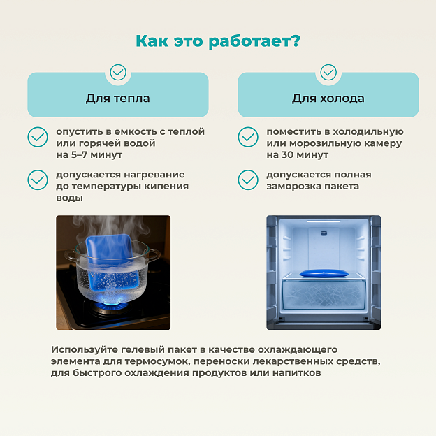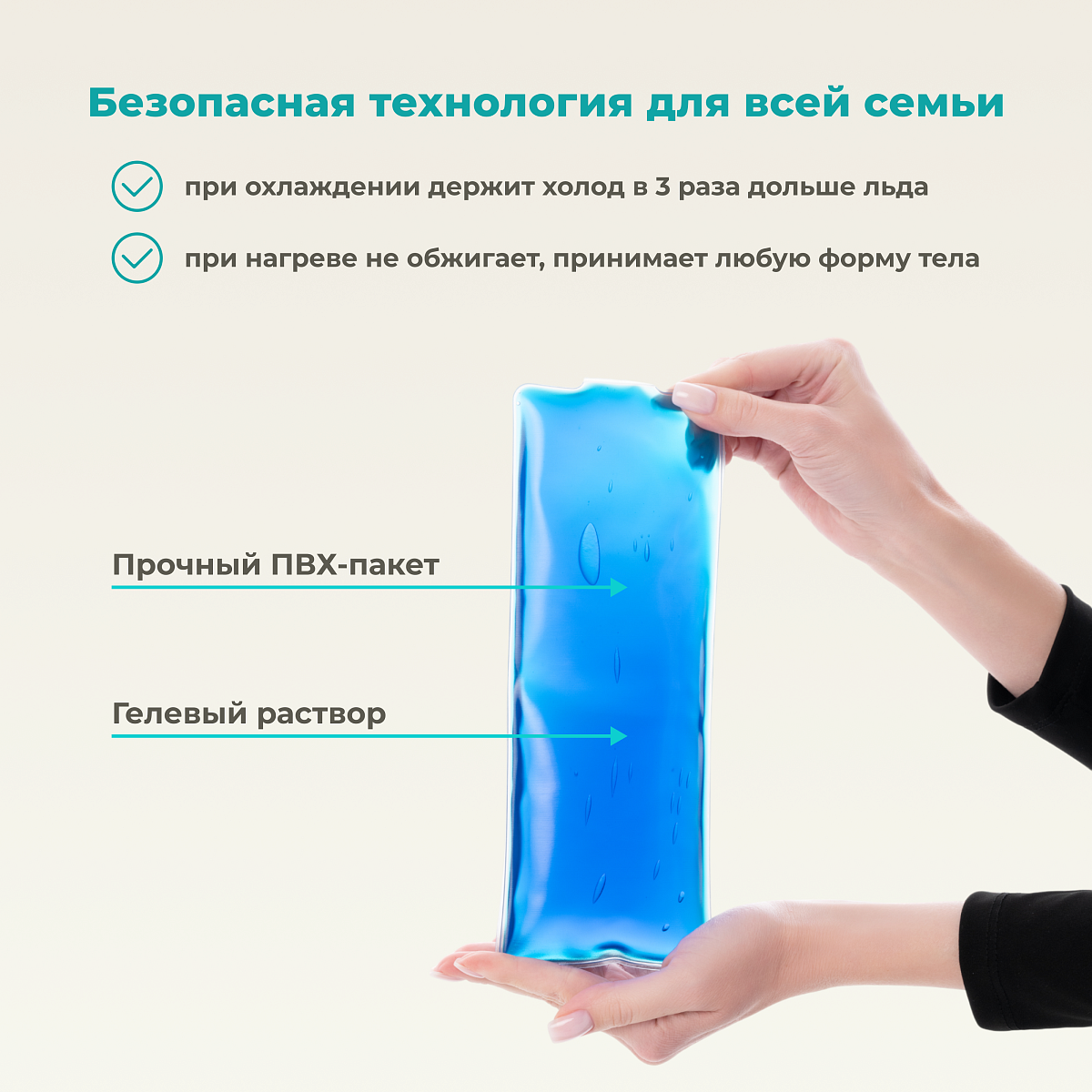 Охлаждающий компресс: Положите гелевый пакет в морозильную камеру холодильника на 30 минут. Допускается полная заморозка гелевого пакета.