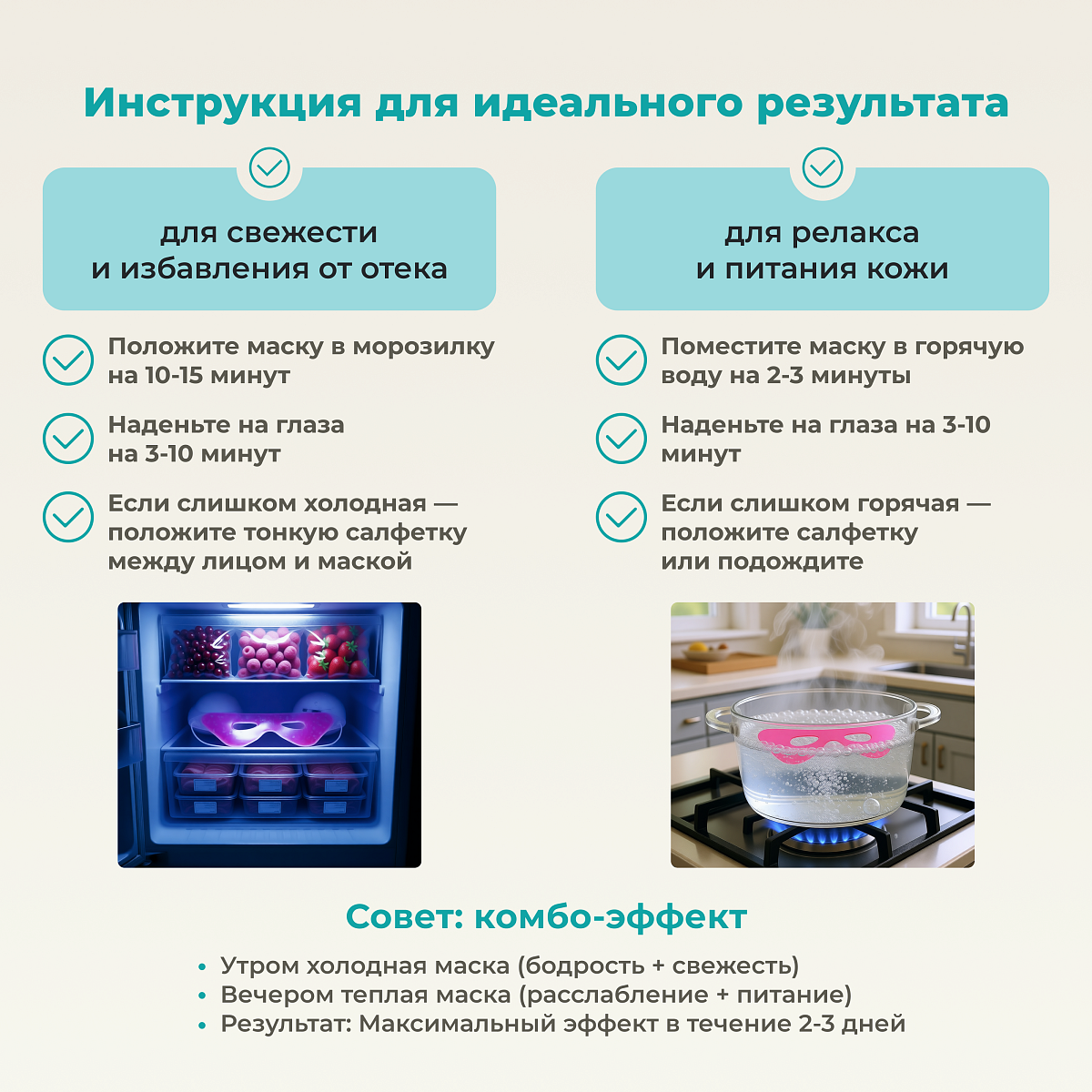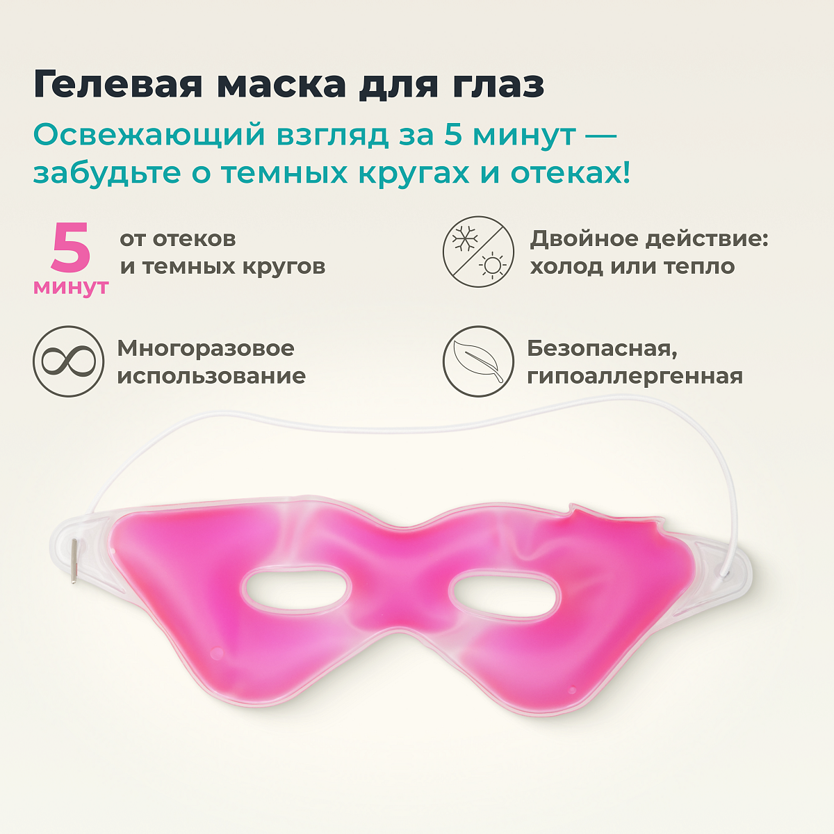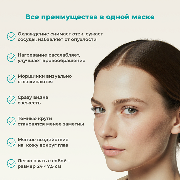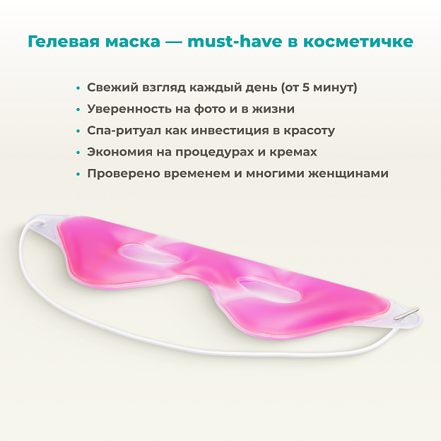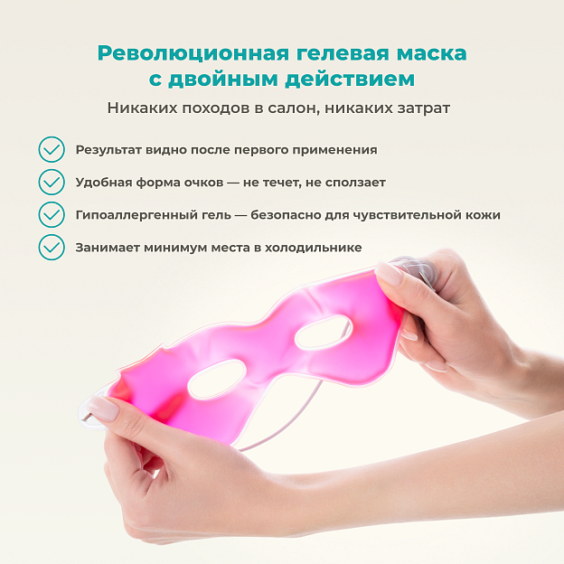 Гелевая маска используется в двух режимах: как холодный компресс для уменьшения отёчности вокруг глаз и как разогревающая маска для снятия спазмов глазных мышц. Её можно применять утром вместо льда, чтобы освежить и подтянуть кожу лица.