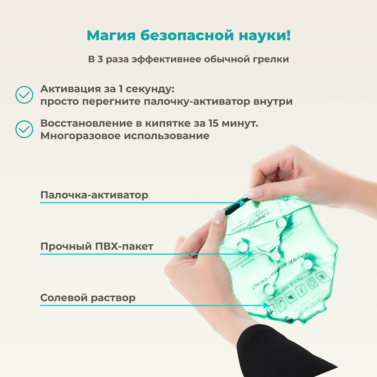 Для запуска солевой грелки «Детская» достаточно слегка перегнуть «волшебную» палочку-пускатель, плавающую внутри. Солевая грелка «Детская» за 10-15 секунд нагреется до оптимальной для процедур температуры +52°С и будет сохранять тепло в течение 40 минут!