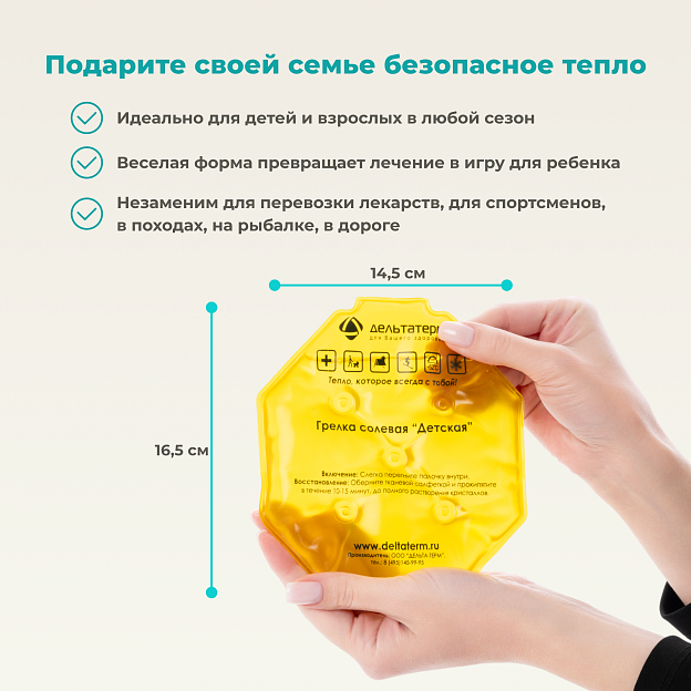 Солевая грелка «Детская» имеет форму восьмигранника. Это даёт возможность её моделирования для различных ситуаций. Предназначена для прогревания области груди при бронхите, трахеите, ОРЗ, рините, гайморите, отите. Применяется вместо горчичников для детей и взрослых. Очень удобно использовать её для отогрева рук на активном отдыхе, рыбалке, охоте, работе.