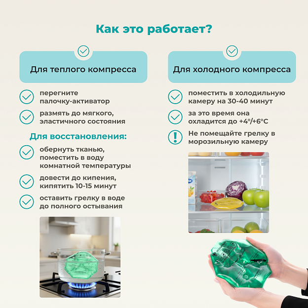 Вы можете использовать солевую грелку «Детская» многократно! Просто прокипятите солевую грелку «Детская» в течение 15 минут, и она снова готова к работе!
