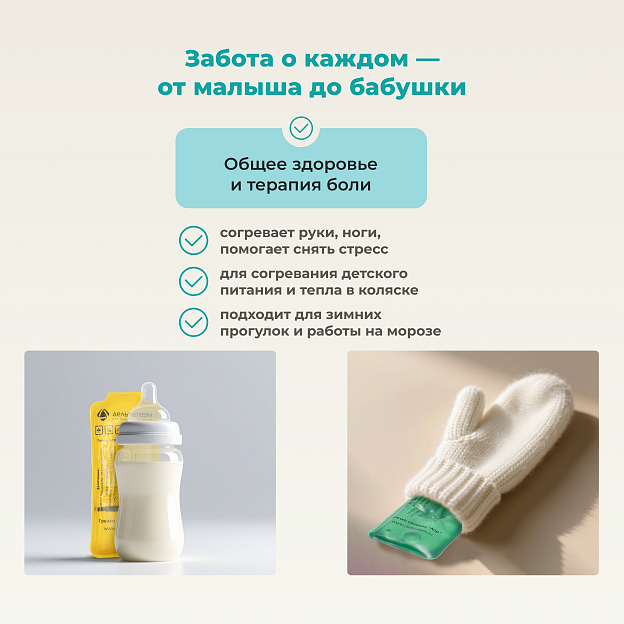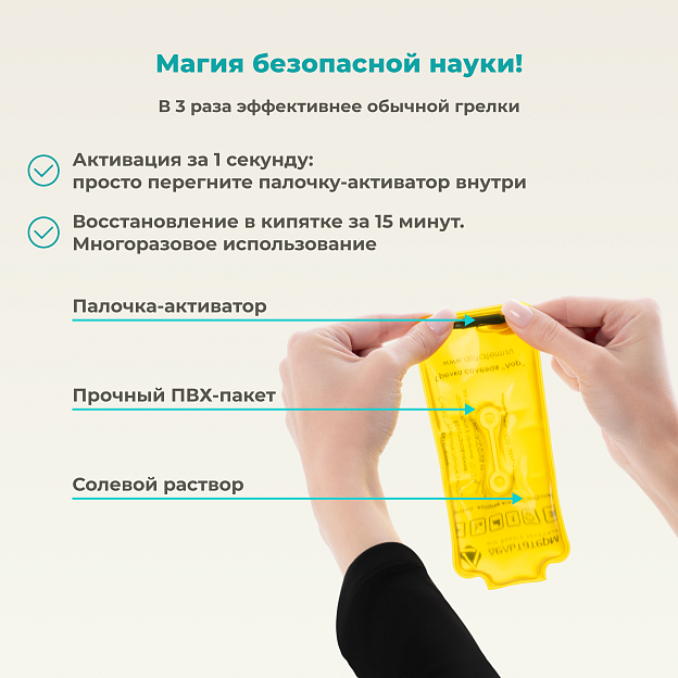 • многофункциональность: изделие можно использовать для согревания рук, техники, в качестве охлаждения при транспортировке продуктов.