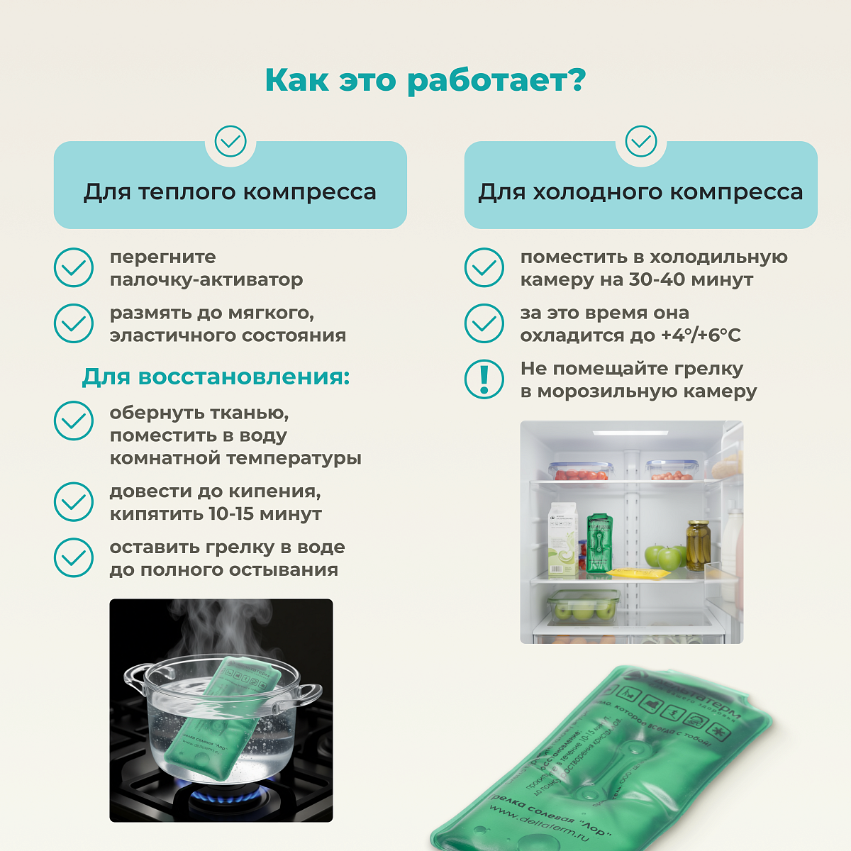 Для прогревания: перегните палочку-пускатель. Для холодной терапии: поместите в холодильник (не в морозилку) на 20 минут. После сеанса прокипятите в воде в течение 10-15 минут для восстановления.