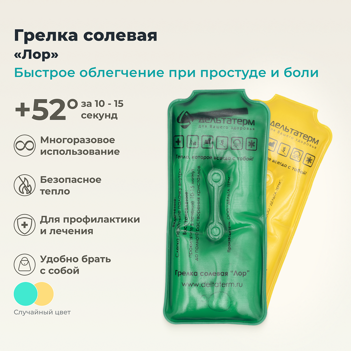 Дельта-Терм «Лор» — это многоразовая солевая грелка двойного действия. Устройство генерирует тепло через процесс кристаллизации ацетата натрия, находящегося в прочной оболочке из ПВХ. При активации гибкой палочки-пускателя грелка моментально нагревается до +52°C, сохраняя температуру до 1 часа. После использования восстанавливается кипячением и может применяться повторно до 1000 циклов. В охлажденном состоянии работает как холодный компресс.