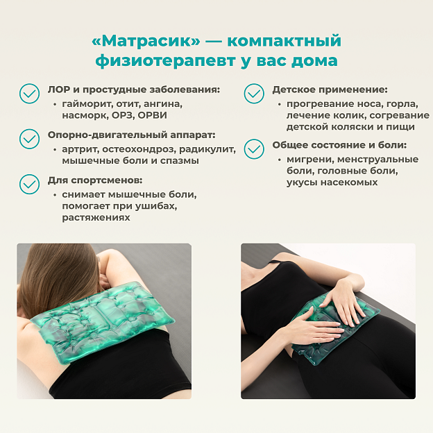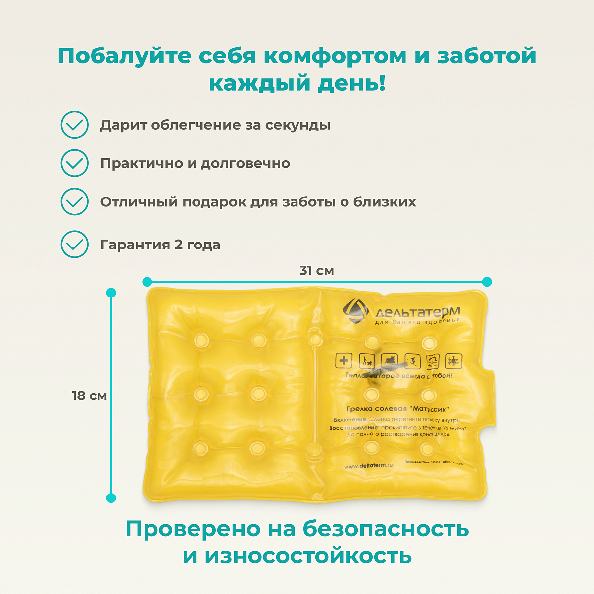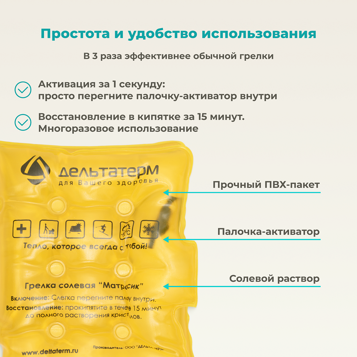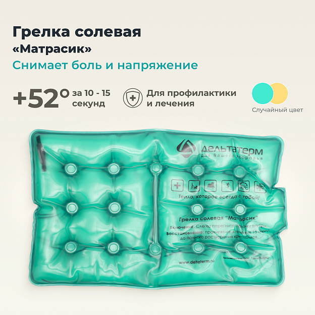 Дельта-Терм «Матрасик» — это многоразовая солевая грелка-компресс увеличенного размера для прогревания или охлаждения больших участков тела. Устройство генерирует тепло через процесс кристаллизации ацетата натрия, находящегося в прочной оболочке из ПВХ. При активации гибкой палочки-пускателя грелка моментально нагревается до +52°C, сохраняя температуру до 1 часа. После использования восстанавливается кипячением и может применяться повторно до 1000 циклов. В охлажденном состоянии работает как холодный компресс.