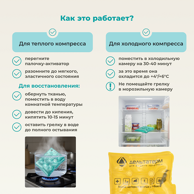 • Для холодной терапии: поместите в холодильник (не в морозилку) на 20-30 минут.
