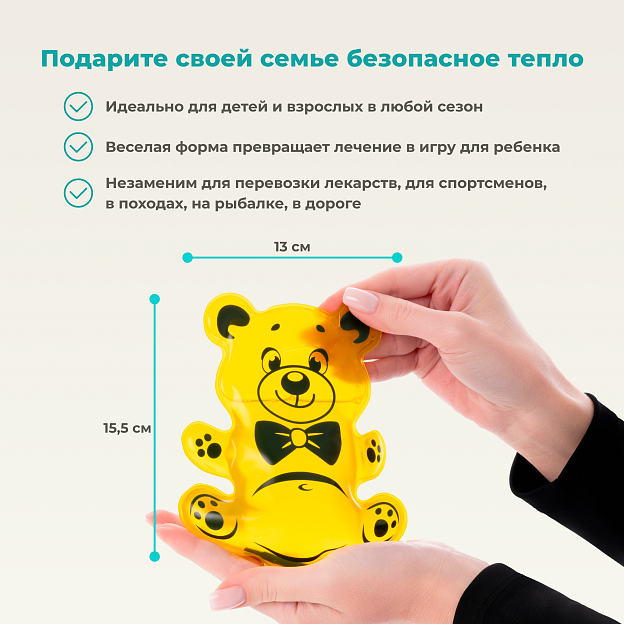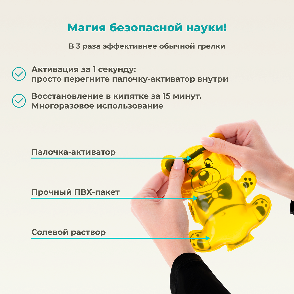 Дельта-Терм «Мишка» — это детская многоразовая солевая грелка, созданная для безопасного прогревания и снятия боли у малышей. Устройство в виде забавного щенка генерирует тепло через процесс кристаллизации ацетата натрия, находящегося в прочной и мягкой оболочке из гипоаллергенного ПВХ. При активации гибкой палочки-пускателя грелка моментально нагревается до комфортной температуры +52°C, сохраняя тепло до 1 часа. После использования восстанавливается кипячением и может применяться повторно до 1000 циклов. В охлажденном состоянии работает как нежный холодный компресс.