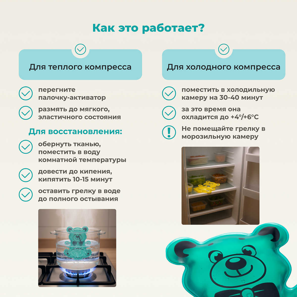 • для холодной терапии: поместите в холодильник (не в морозилку) на 15-20 минут;
