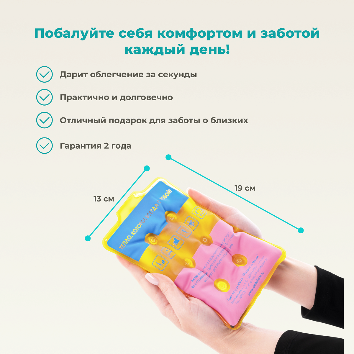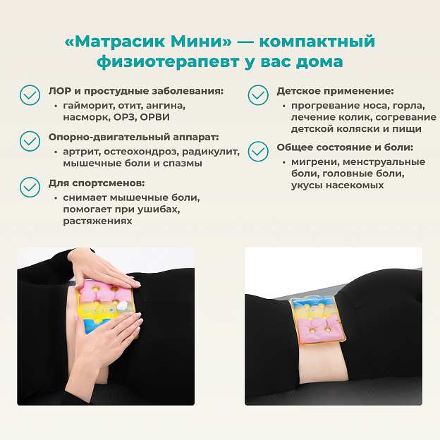 Грелка солевая Матрасик Мини имеет очень удобный размер 13х19 см. Эргономичная форма грелки идеально подходит для прогревания больших участков тела (поясницы, спины). Его можно использовать на прогулках с детьми (вкладывать в коляску), в походах (в спальный мешок). Можно найти множество применений этому чудо-матрасику Мини.