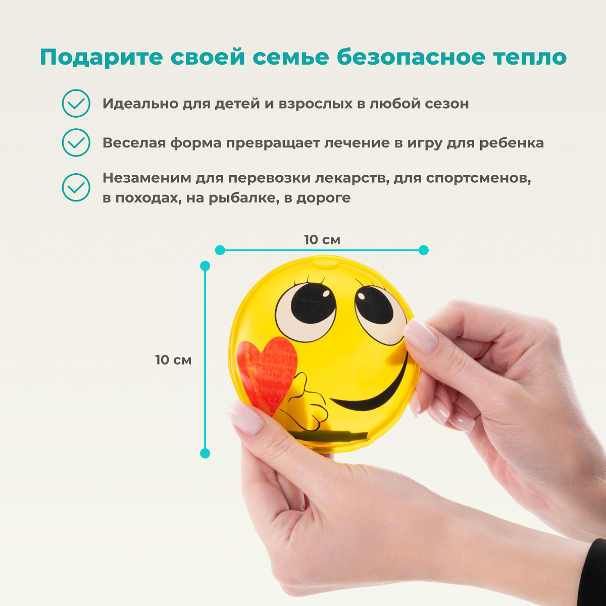Дельта-Терм «Смайл» — это детская многоразовая солевая грелка, созданная для безопасного прогревания и снятия боли у малышей. Устройство в виде рожицы с улыбкой и сердечком генерирует тепло через процесс кристаллизации ацетата натрия, находящегося в прочной и мягкой оболочке из гипоаллергенного ПВХ. При активации гибкой палочки-пускателя грелка моментально нагревается до комфортной температуры +52°C, сохраняя тепло до 1 часа. После использования восстанавливается кипячением и может применяться повторно до 1000 циклов. В охлажденном состоянии работает как нежный холодный компресс.