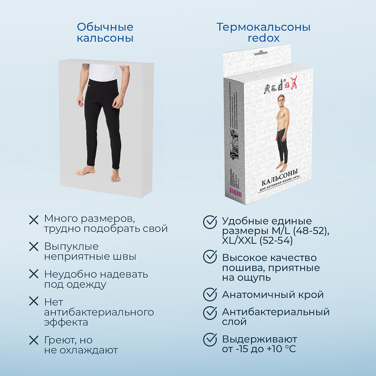 Классические мужские кальсоны, сделанные из четырехмерного спандекса, обеспечат вас теплом и комфортом на весь день! Уникальный пошив и материал обеспечат идеальную посадку без зажимов, трения, колющих ощущений и раздражения. Термобелье позлит комфортно работать, заниматься спортом или отдыхать, сохраняя тепло и хорошее самочувствие!
