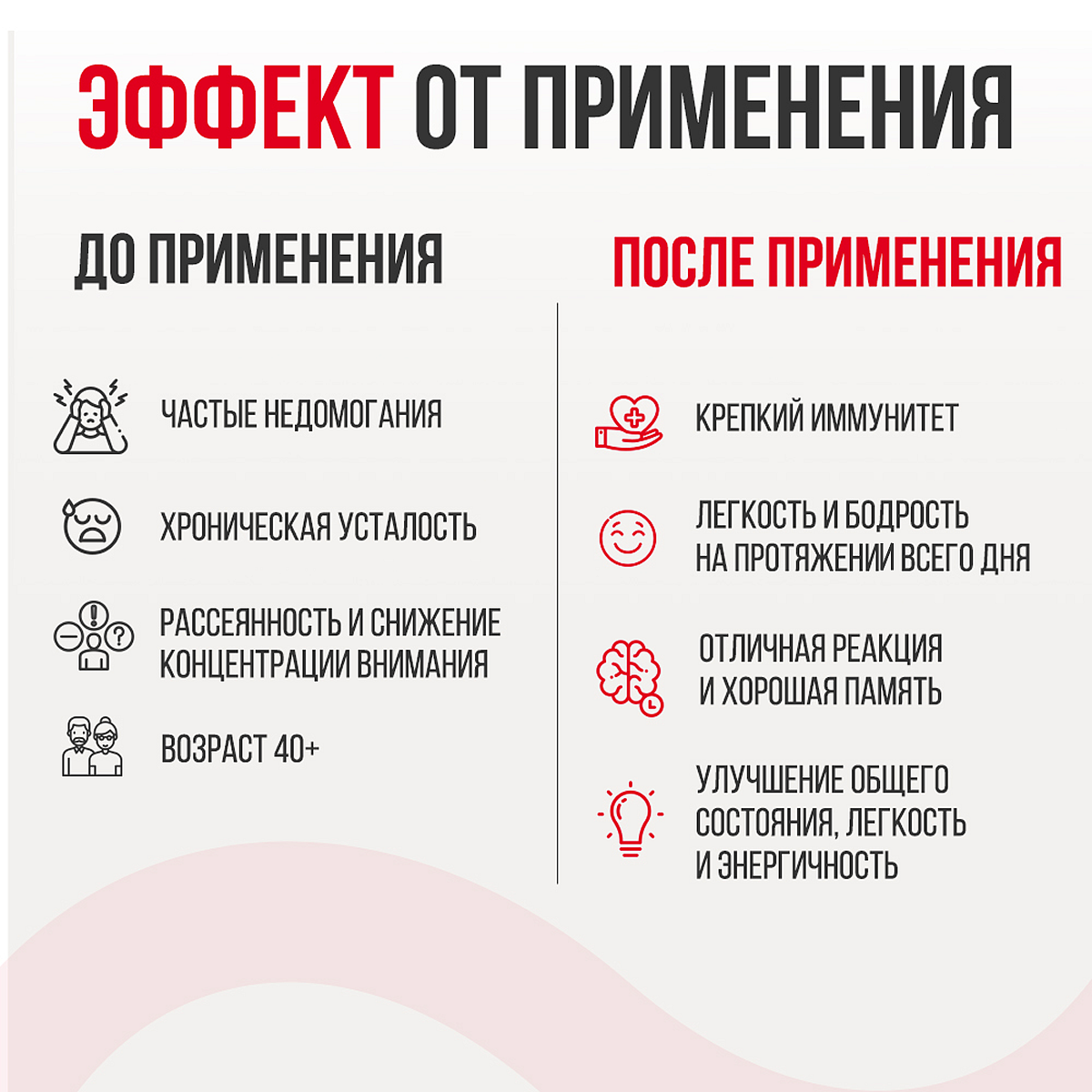 • Повышает физическую выносливость и работоспособность, дает заряд энергии, помогает избавиться от хронической усталости.