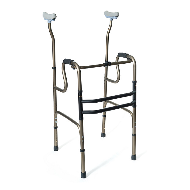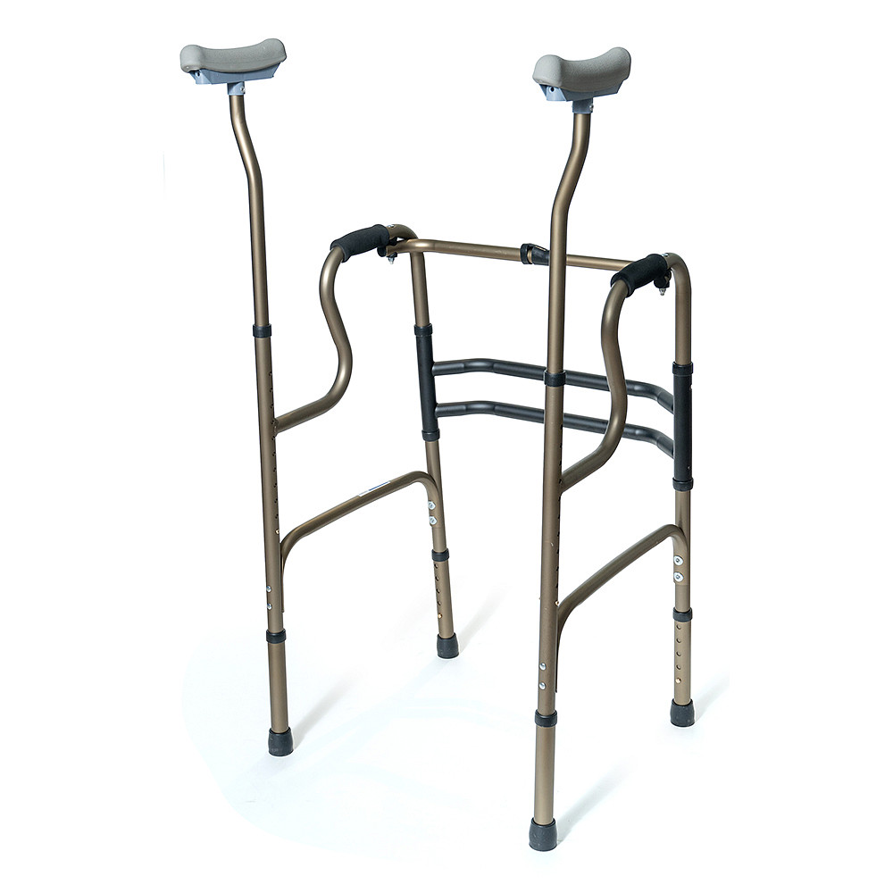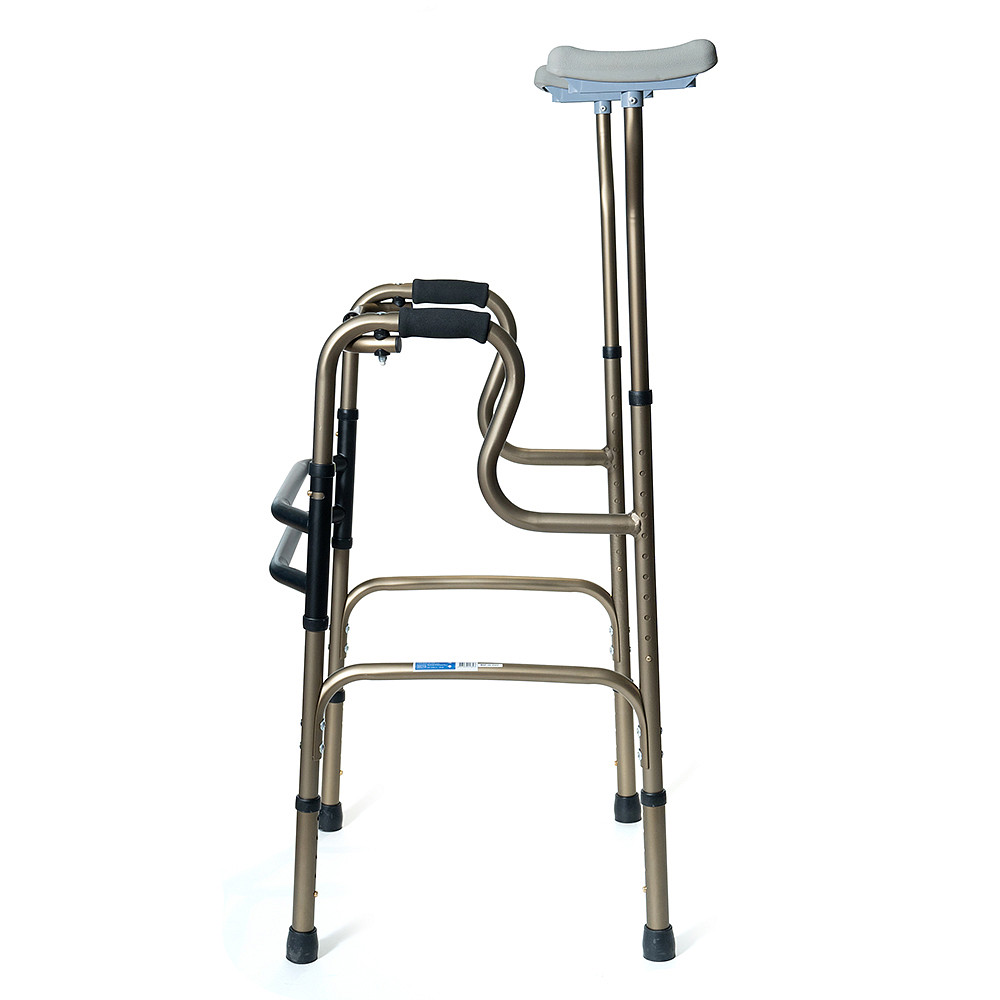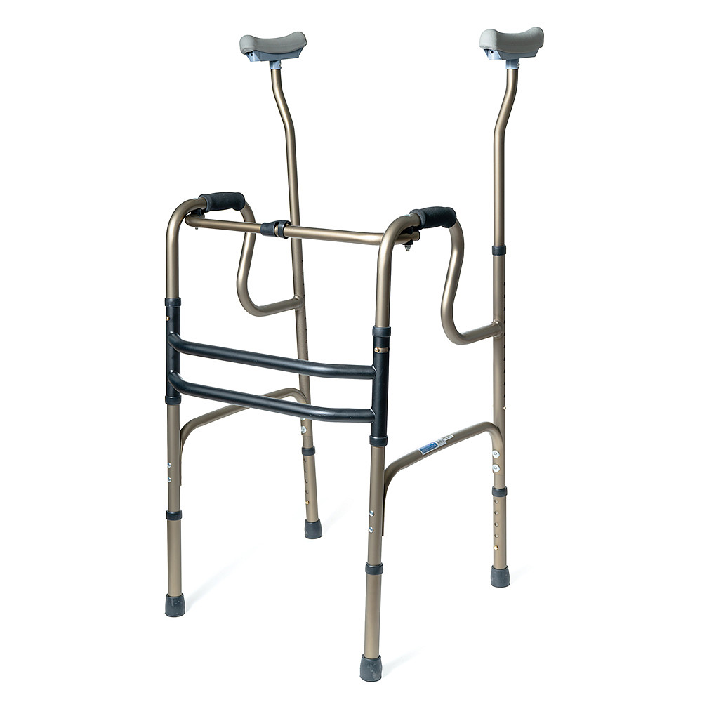 Двухуровневые шагающие опоры-ходунки СИМС-2 10189 со съемными подмышечными стойками и алюминиевой рамой весом 3,6 кг обеспечивают безопасное передвижение пользователей весом до 135 кг в больницах, дома и на улице. Складная конструкция не оставляет следов на полу, а регулировка высоты шагом 2,5 см подходит под рост 160-180 см. Расстояние между поручнями 53 см и подмышечные опоры создают стабильную поддержку при ходьбе.