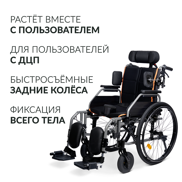 • боковые фиксаторы, абдуктор и мягкие опоры под голени делают коляску подходящей для людей с ДЦП;