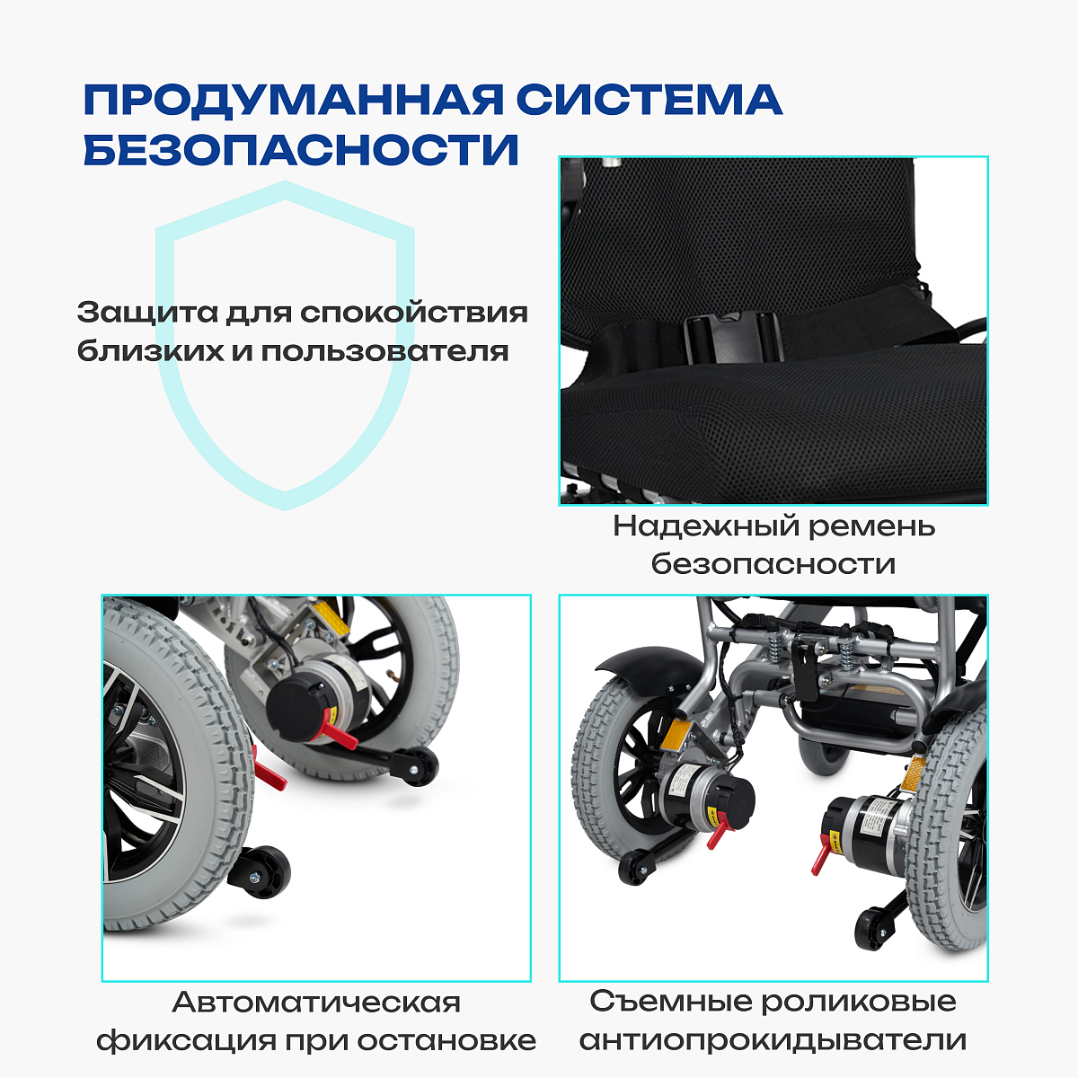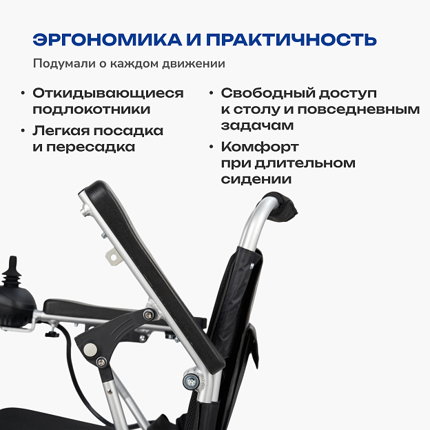 • автоматический электромагнитный тормоз фиксирует коляску при остановке, повышая безопасность;