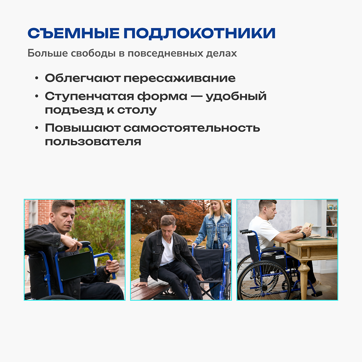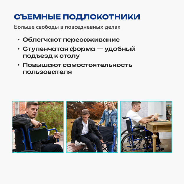 • съемные подлокотники ступенчатой формы для удобного подъезда к столу и облегчения пересаживания;