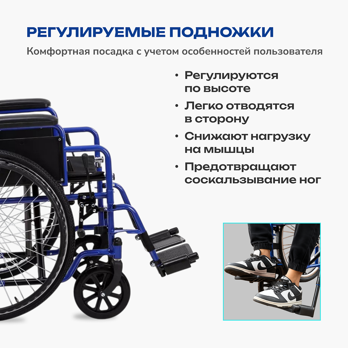 • поворотные съемные подножки, регулируемые по высоте, с удобной подставкой под голени;