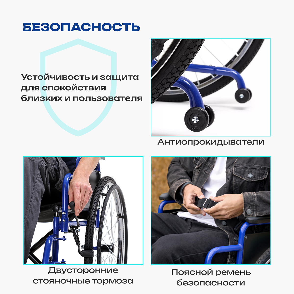 • антиопрокидыватели, стояночные тормоза и поясной ремень безопасности повышают уровень защиты пользователя;