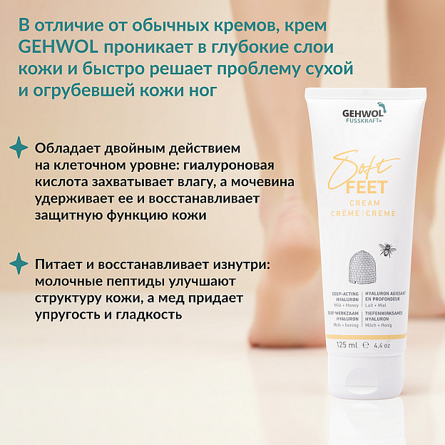 Шелковый крем Gehwol создан для ухода за сухой и чувствительной кожей стоп, когда хочется не только убрать шероховатости, но и вернуть ногам ухоженный вид. Масло авокадо, экстракт меда и молочные пептиды помогают коже стать более упругой и гладкой, уменьшают ощущение сухости и стянутости. Гиалуроновая кислота в сочетании с мочевиной поддерживает увлажненность в более глубоких слоях кожи, смягчает огрубевшие участки и препятствует появлению новых трещин. Экстракт меда дополнительно смягчает и немного успокаивает кожу, а молочные протеины работают как мягкий увлажняющий компонент.