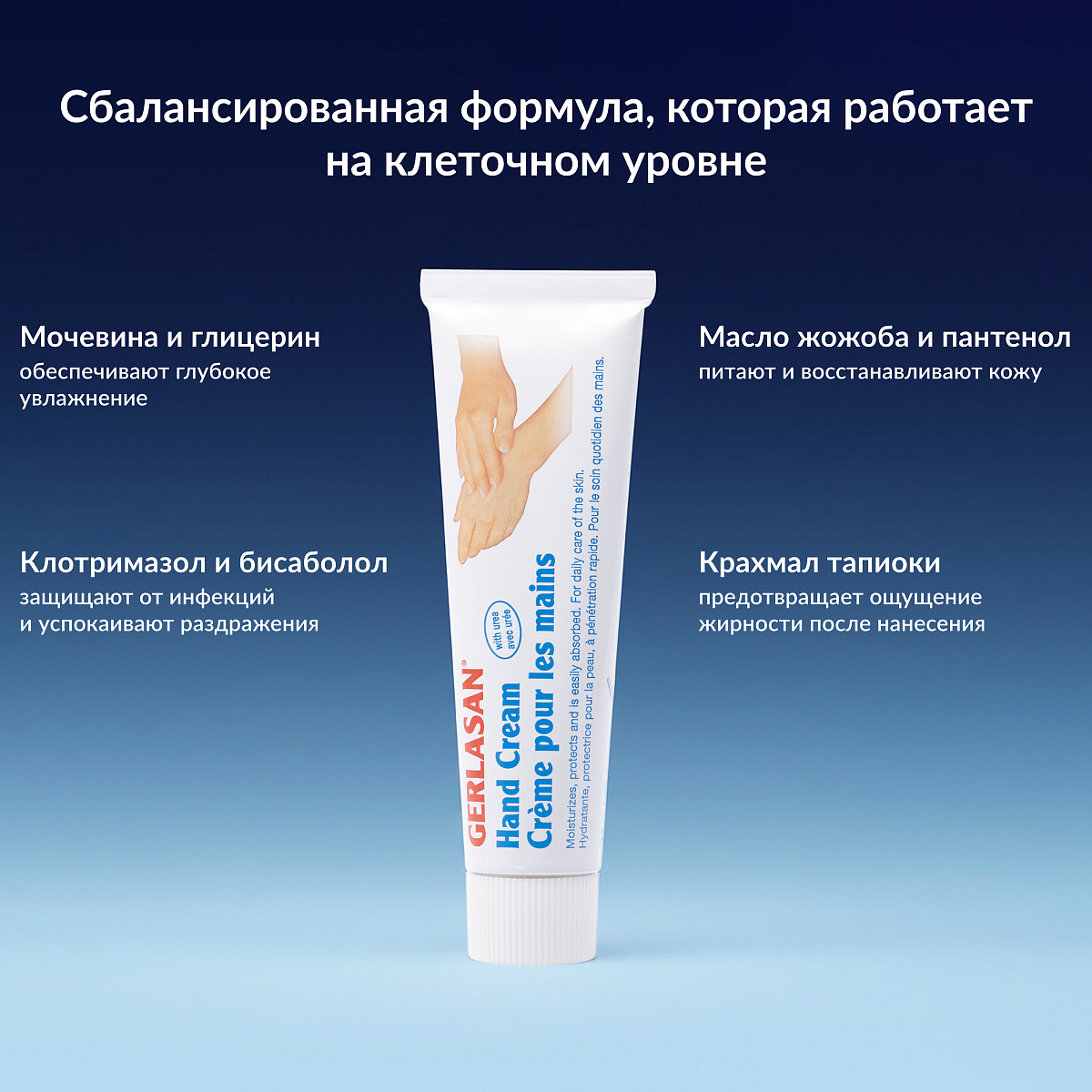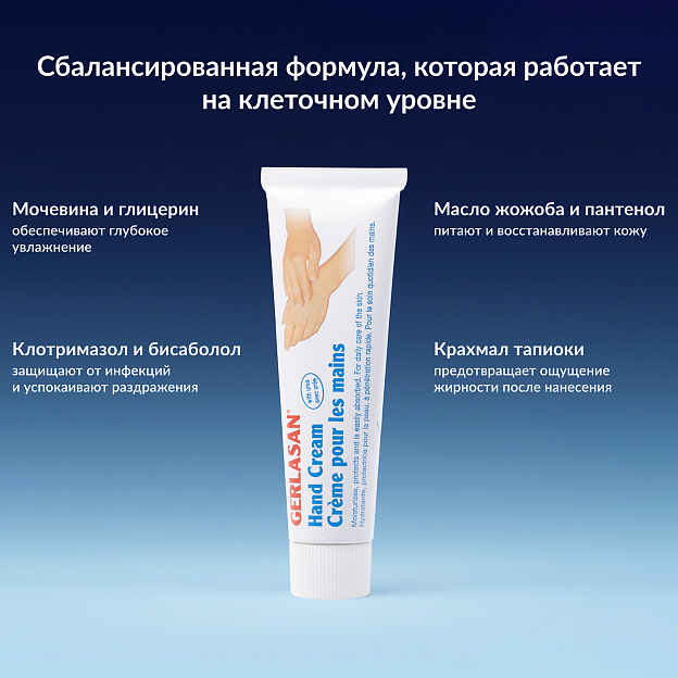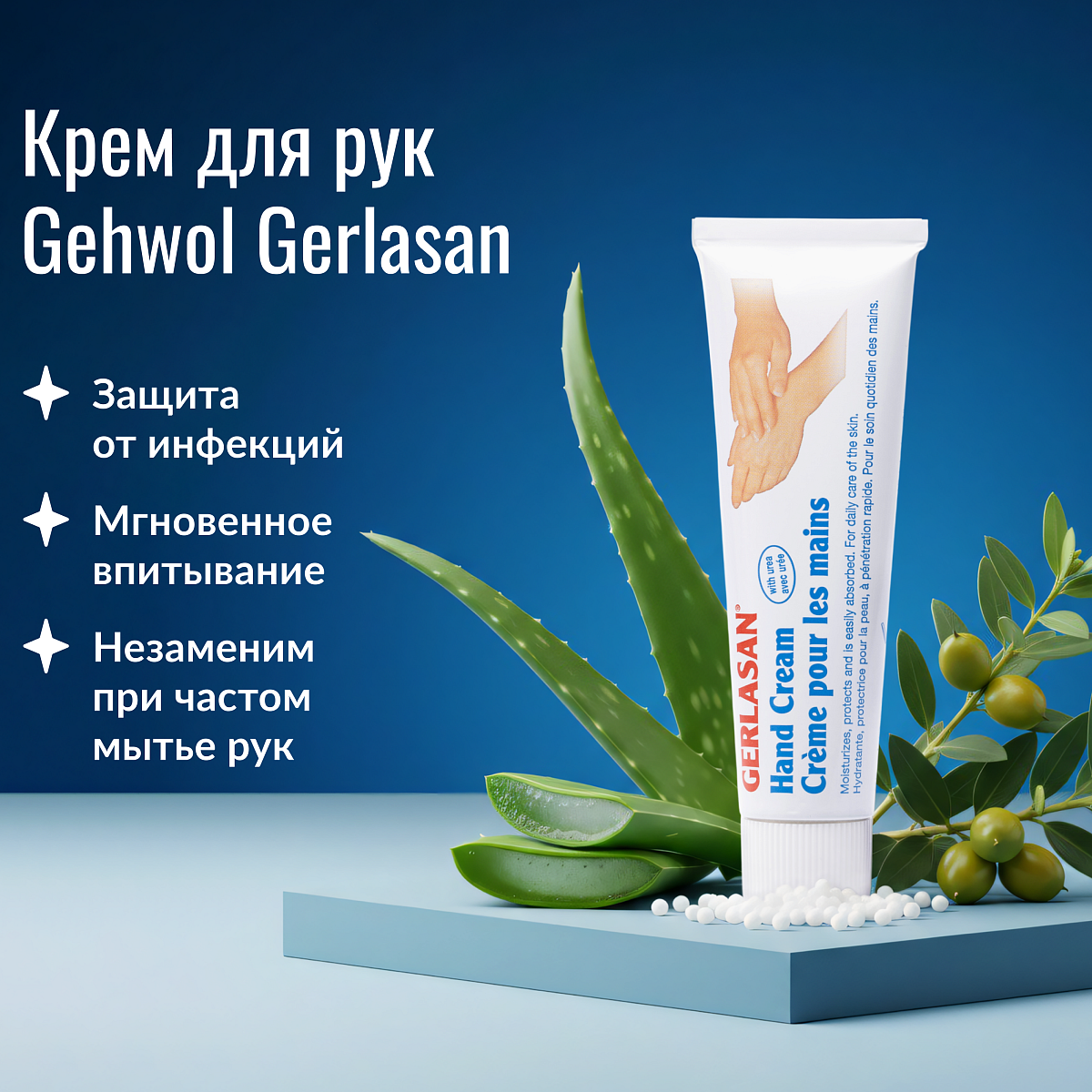 Крем для рук Gehwol Герлазан создан для ежедневной защиты рук, которые сталкиваются с регулярными повреждениями: частое мытье, антисептики, работа с водой и средствами ухода. Тапиоковая пудра придает крему особую, «сухую» текстуру: после нанесения не остается ощущения липкости, жирной пленки или скольжения, кожа сразу комфортна при касании. Увлажняющий комплекс на основе мочевины и экстракта алоэ вера помогает удерживать влагу, смягчает сухие участки и поддерживает кожу рук гладкой и эластичной в течение дня.