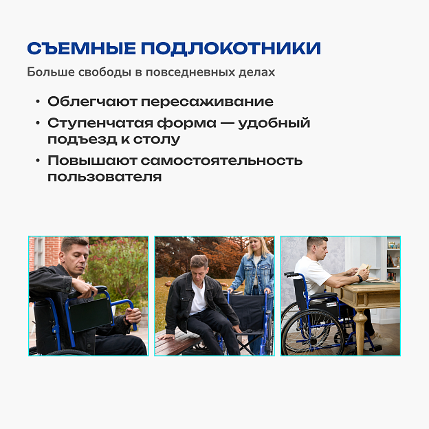 • съемные подлокотники ступенчатой формы для удобного подъезда к столу и облегчения пересаживания;