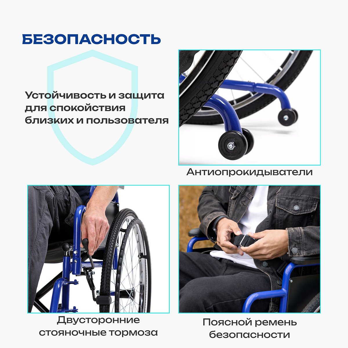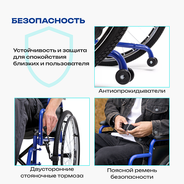 • антиопрокидыватели, стояночные тормоза и поясной ремень безопасности повышают уровень защиты пользователя;