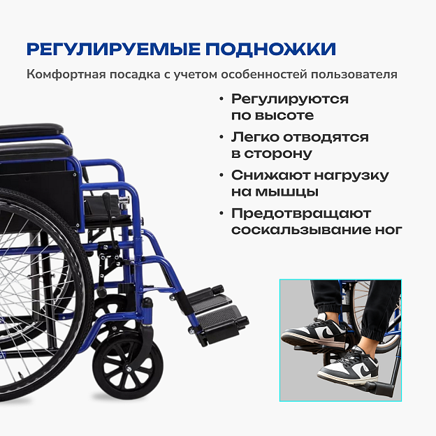 • поворотные съемные подножки, регулируемые по высоте, с удобной подставкой под голени;