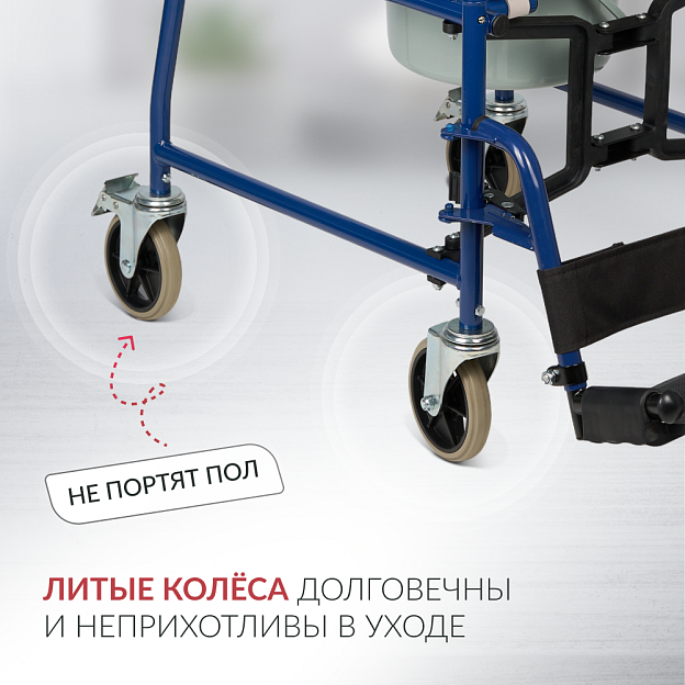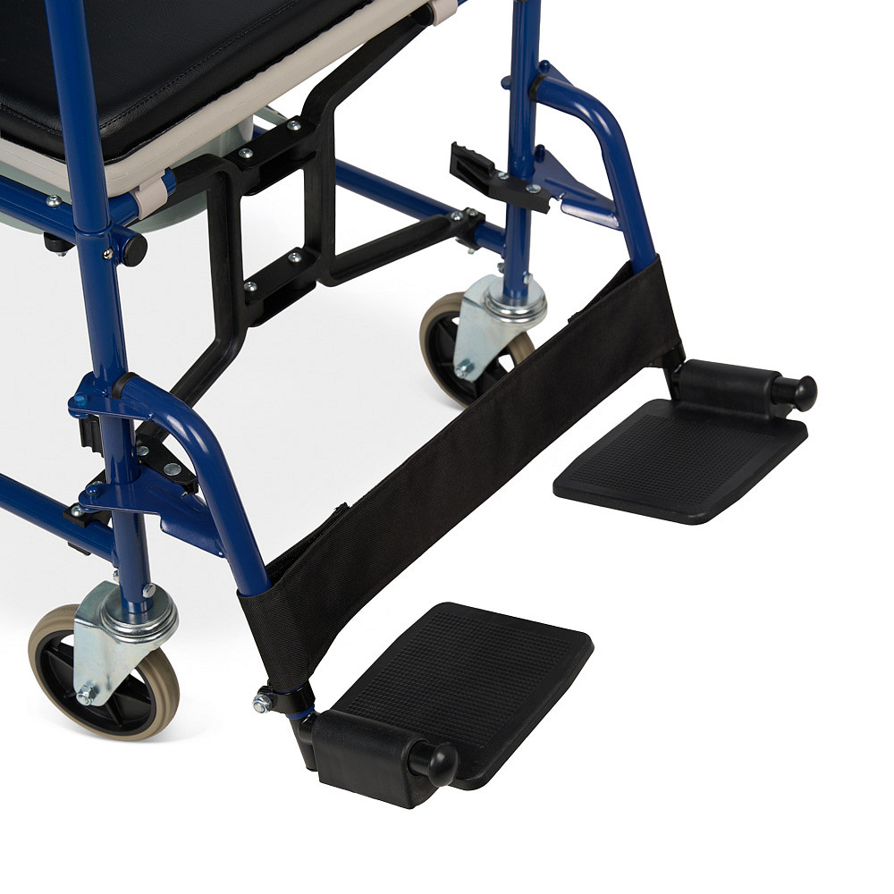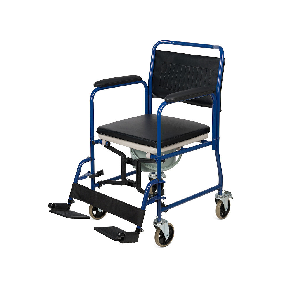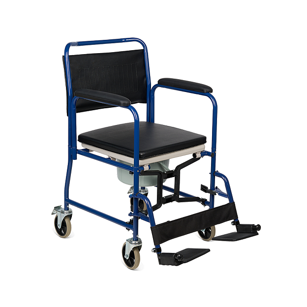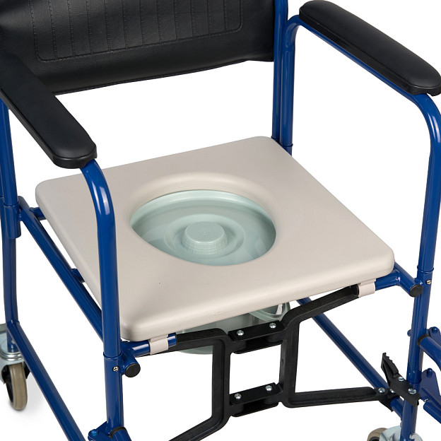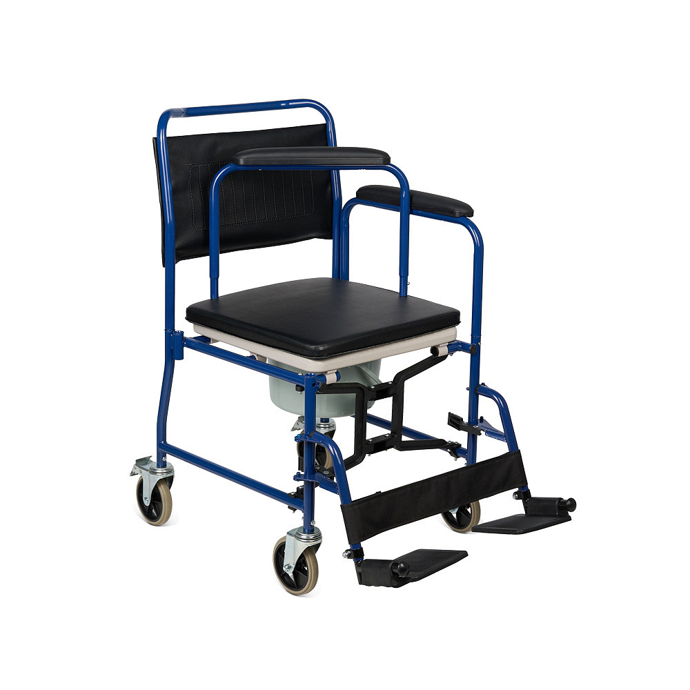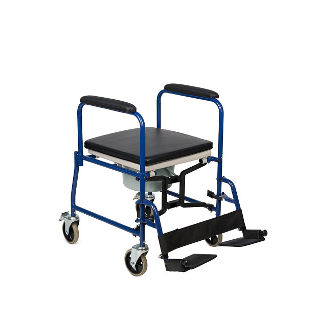 Кресло-коляска Armed KR 009В со складной рамой из металлического сплава сочетает функции транспортного средства и санитарного оборудования. Модель рассчитана для пользователей весом до 130 кг. Съемная санитарная емкость из пластика с мягким сиденьем из кожзама и ленточным упором для ног обеспечивает гигиеничное использование в помещении и поездках, а съемные откидные подножки регулируются по высоте. Педальные тормоза на цельнолитых колесах и съемные подлокотники гарантируют безопасность и удобный трансфер.