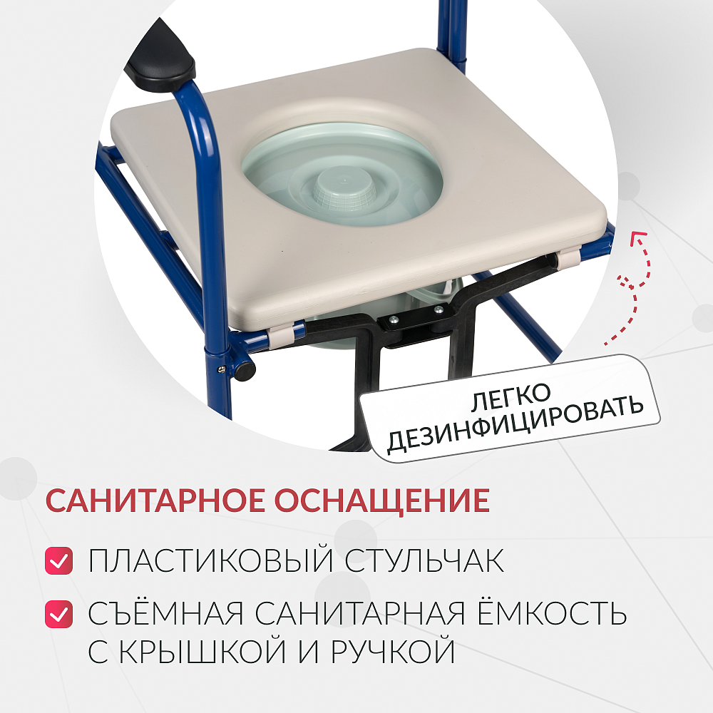 • санитарная емкость, мягкое сиденье, упор для ног;