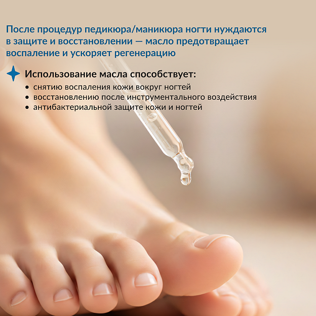 Не только в домашних условиях, но и после процедур маникюра и педикюра для защиты и восстановления ногтевой пластины и кожи вокруг нее. Подходит как часть ухода за ногтями пальцев ног, включая уход за диабетической стопой по рекомендации врача.