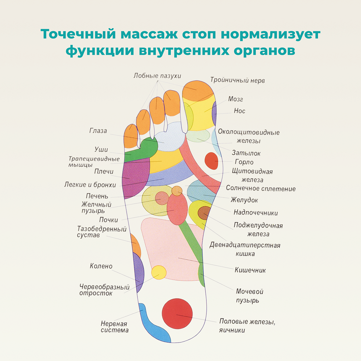 Массажные шипы стимулируют биологически активные точки на стопах ног, что положительно сказывается на всём организме, так как на стопах расположено множество акупунктурных точек, связанных с различными органами.