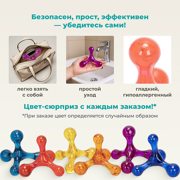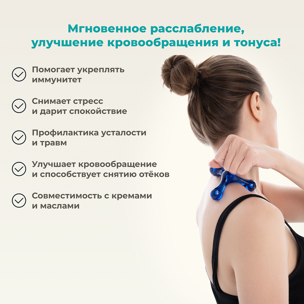 Подходит для массирования ступней, икр, бедер, поясницы, спины, шеи, головы, живота, стоп ног и ладоней рук.