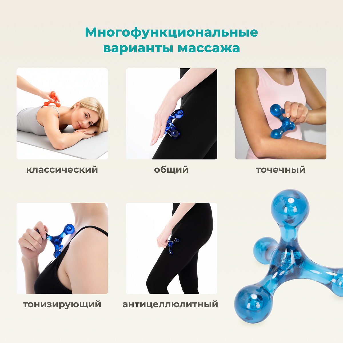 Этот вид массажа разрушает целлюлитные отложения, устраняет застой лимфы и активизирует кровообращение. В результате разрушаются перегородки из соединительной ткани между жировыми клетками, создаются условия для активизации обменных процессов в застойных целлюлитных зонах и расщепления жира. Начинать массаж следует с правой ноги и перемещать массажер вверх от колена к бедру (используйте два шарика). Ягодицы массируются в направлении от середины таза к бедру (используйте три шарика). Живот массируют двумя или тремя шариками по часовой стрелке. Перед антицеллюлитным массажем важно разогреться (ванна, душ, баня). Разглаживание кожи — реальная задача для самомассажа. С помощью «Тетракома» его можно проводить где угодно: в машине, на работе, на пляже, дома. Для профилактики целлюлита регулярно разглаживайте проблемные зоны! Результат — упругие гладкие бедра, плоский живот и подтянутые, крепкие ягодицы.