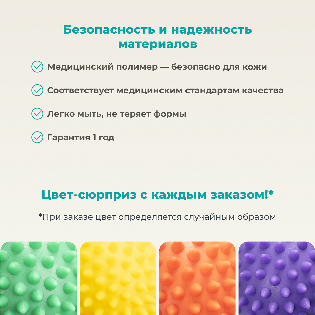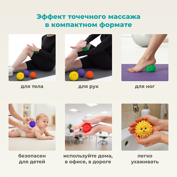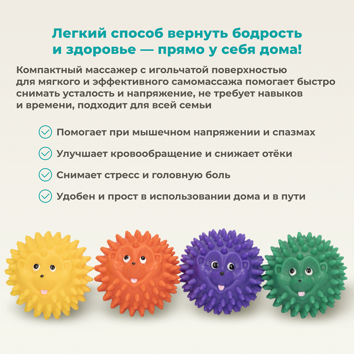 Используя массажный мяч «Шарик-ёжик», вы можете самостоятельно выполнять мягкий массаж ладоней, стоп и всего тела. Этот массаж повышает мышечный тонус кожи, улучшает кровообращение и работу периферической и центральной нервной системы.