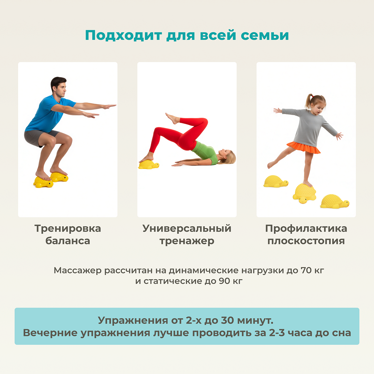 Полусфера «Черепашка» идеально подходит для спортивных игр, разнообразных гимнастических упражнений и занятий фитнесом. Физическая активность особенно важна для тех, кто испытывает усталость в утреннее и вечернее время.