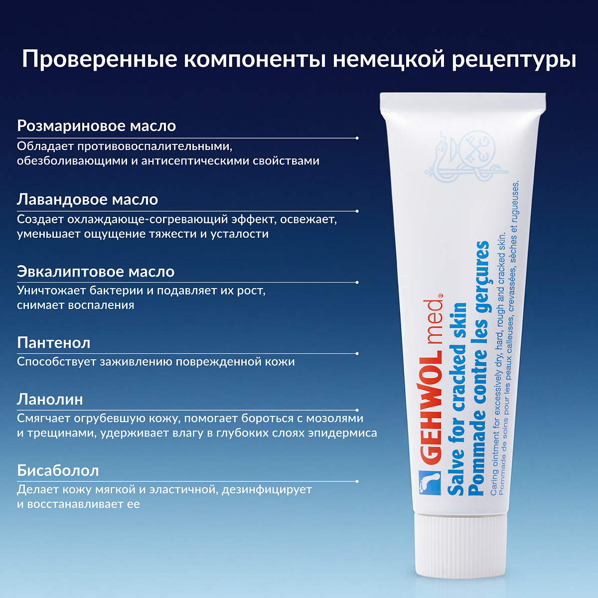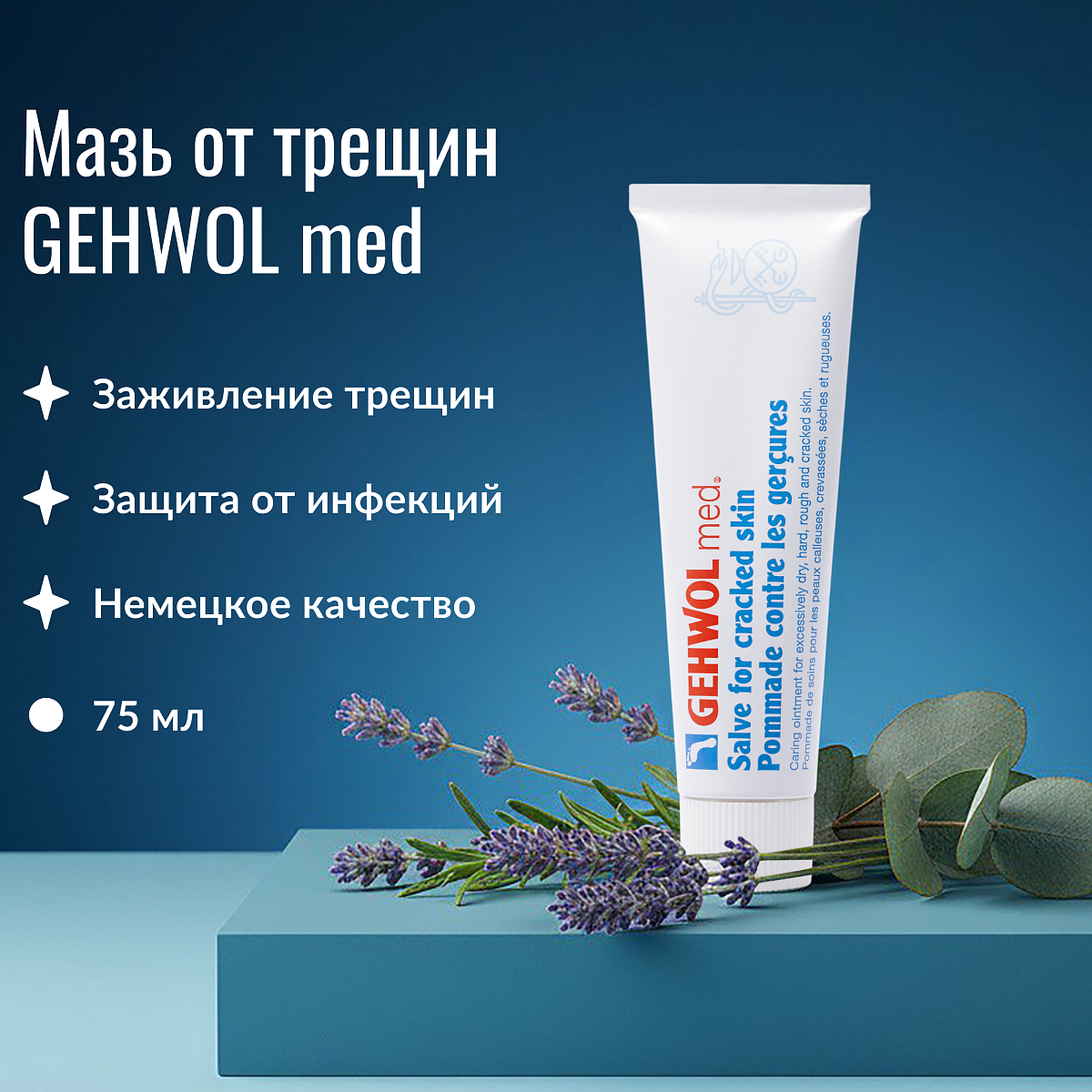 Мазь для стоп Gehwol разработана специально для ухода за жесткой, сухой и растрескавшейся кожей, когда обычный увлажняющий крем уже не справляется. Плотная питательная текстура помогает смягчить грубые участки, уменьшить болезненность трещин и создать на поверхности кожи защитную пленку. В составе сочетаются натуральные эфирные масла лаванды, розмарина и эвкалипта, пантенол, бисаболол и базовая основа из ланолина, благодаря чему средство одновременно питает, успокаивает и поддерживает регенерацию кожи. Крем подходит и для заживления трещин на руках, рекомендуется как часть ухода за диабетической стопой по согласованию с врачом.