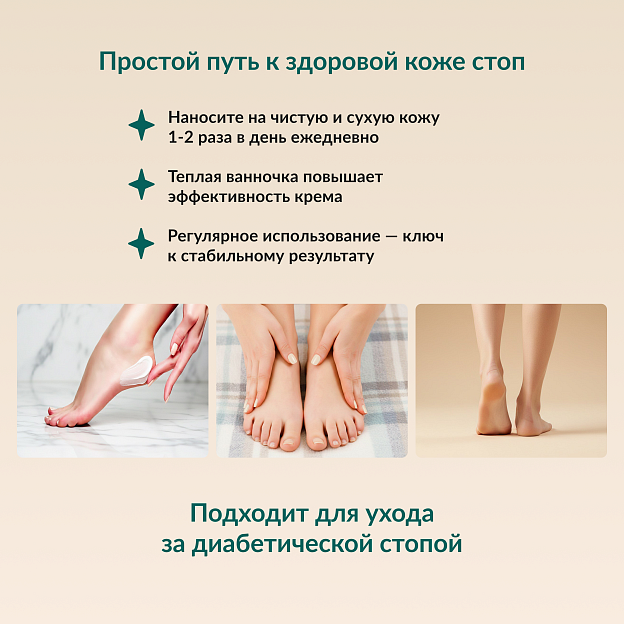 • средство универсально: его можно использовать и как интенсивный уход за стопами (в том числе при диабетической стопе по рекомендации специалиста), и как заживляющий крем для рук при трещинах и сильной сухости.