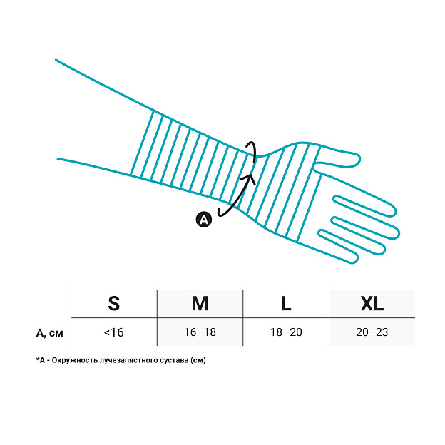 Для правильного выбора размера ортеза ORLETT WRS-306 cантиметровой лентой плотно, но не утягивая, измерить окружность лучезапястного сустава. Согласно полученным результатам подобрать ортез по таблице подбора размеров.
