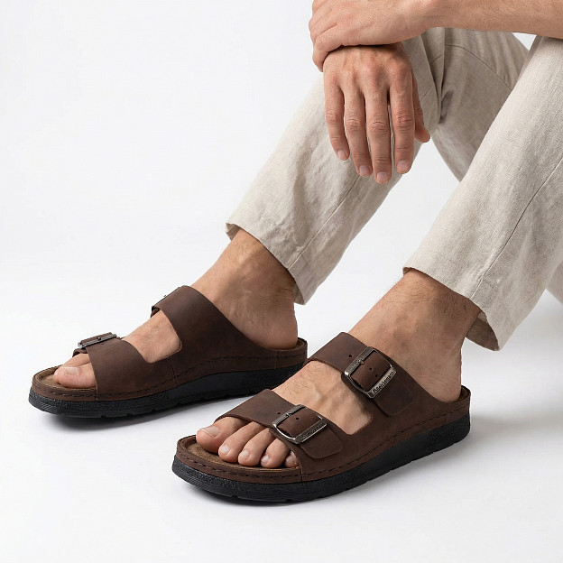Фиксация и регулировка по подъему и полноте осуществляется за счет двух кожаных ремешков на пряжке — они обеспечивают полное раскрытие и легкость надевания и снятия. Несъемные ортопедические пятифазные стельки с поддержкой сводов с покрытием из натуральной кожи обеспечивают максимальное удобство при длительном нахождении на ногах. Модель оснащена широкой подошвой из облегченного полиуретана.