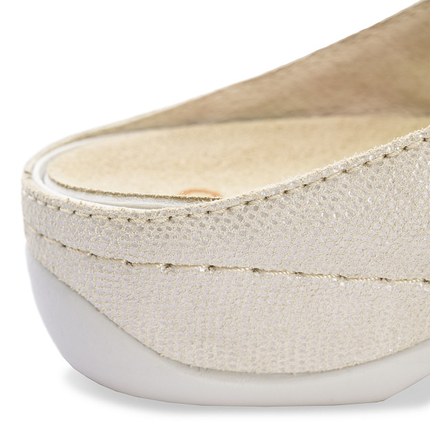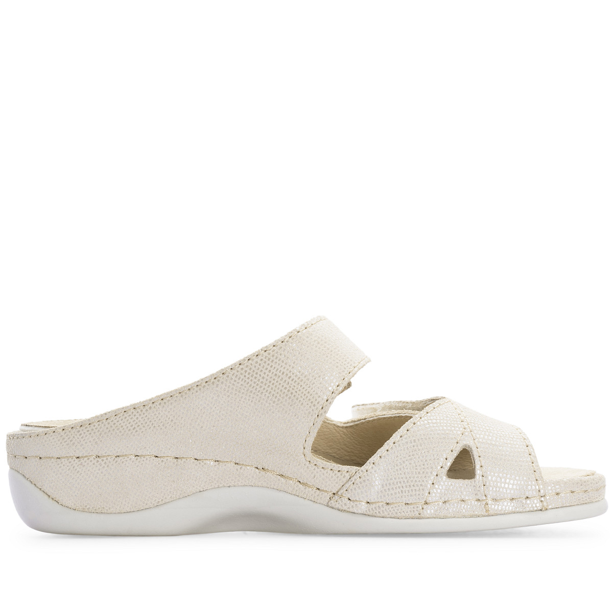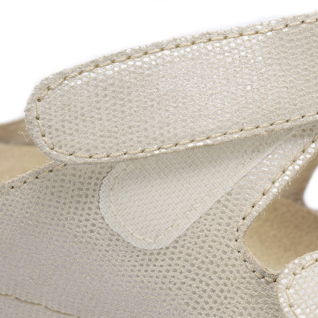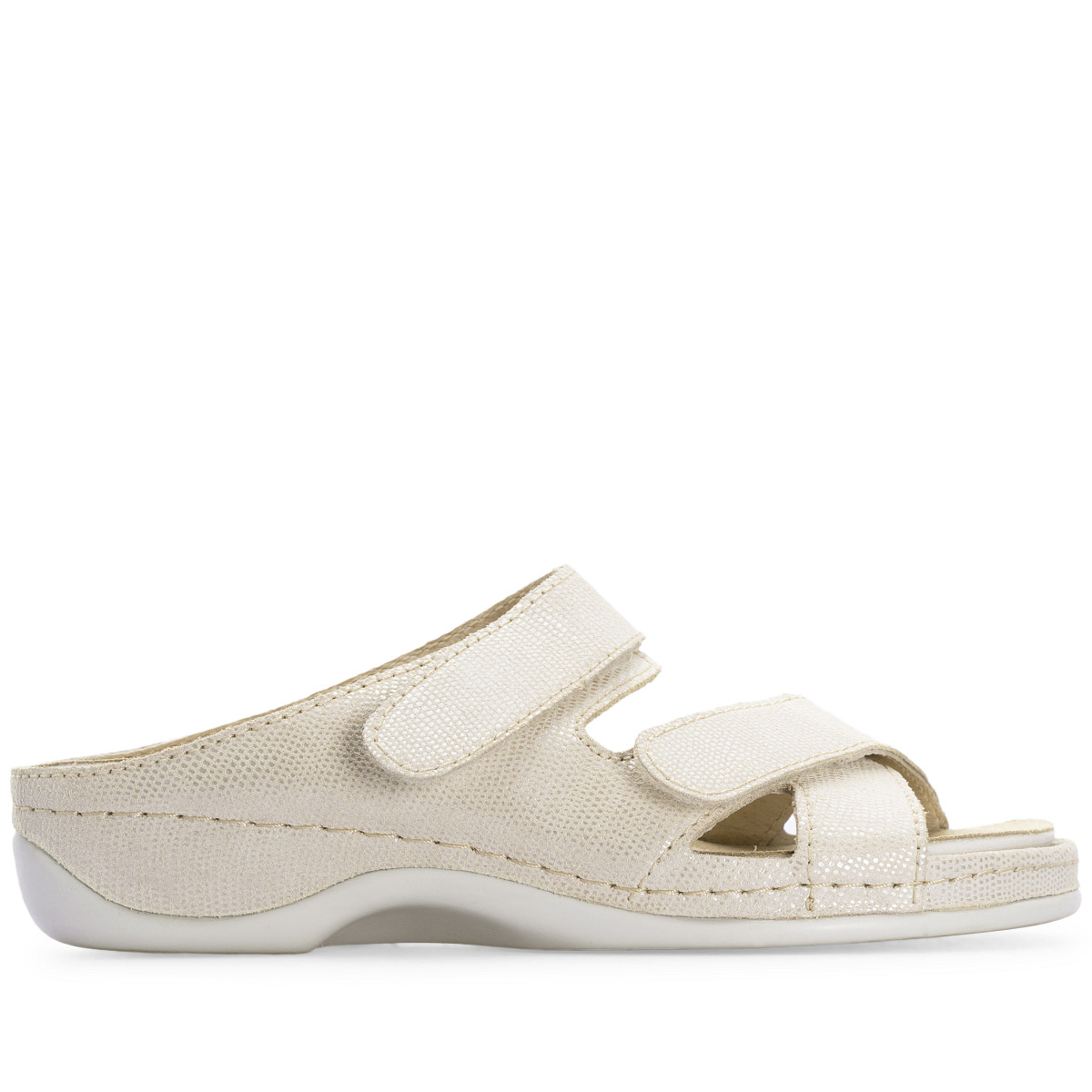 Два широких ремешка на застежках Velcro позволяют легко подстроить объем под особенности стопы и возможные отеки, а подкладка из натуральной кожи обеспечивает приятный контакт с телом в течение всего дня. Легкая полиуретановая подошва поддерживает стопу и смягчает ударную нагрузку при ходьбе, помогая уменьшить ощущение усталости к концу дня.