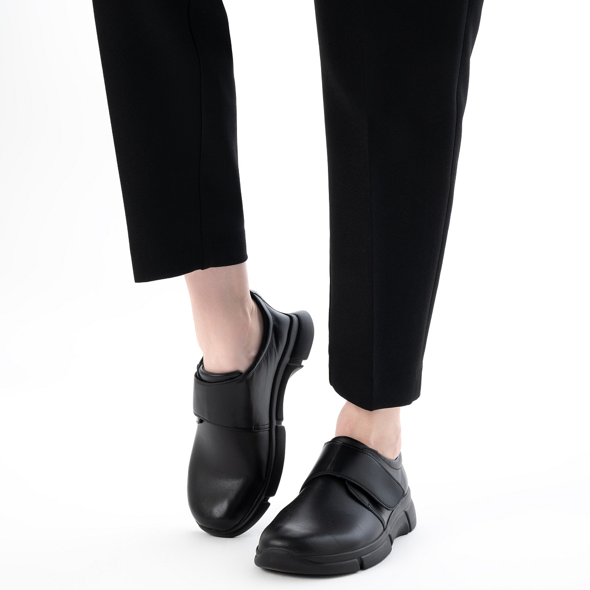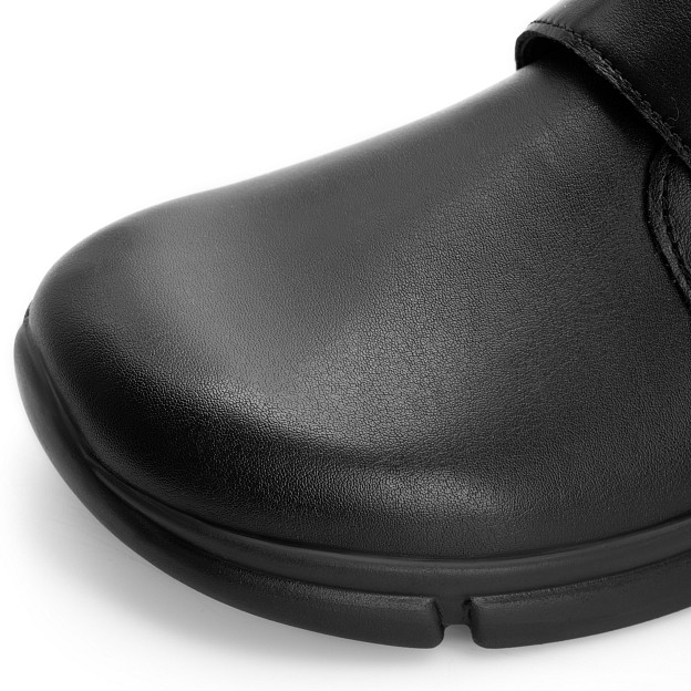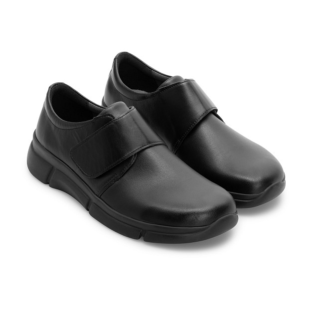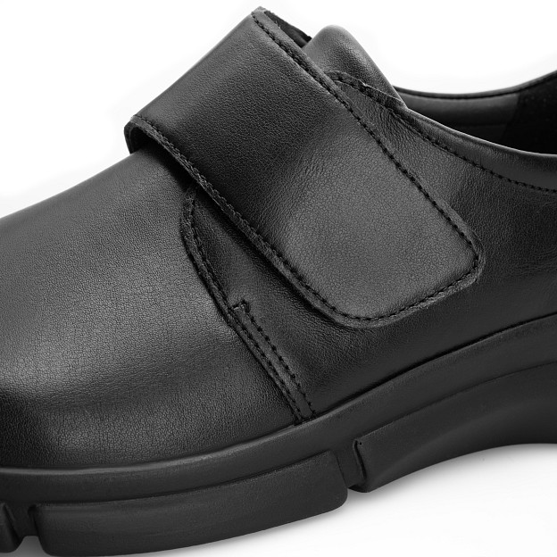 Стрейчевый мыс подстраивается под «сложные» участки стопы, а застежка на липучке Velcro помогает быстро зафиксировать обувь и отрегулировать посадку по подъему. Внутренняя отделка из натуральной кожи и текстиля создает комфортный микроклимат, а легкая полиуретановая подошва делает пару удобной для долгой ходьбы. Пятифазная стелька поддерживает стопу на каждом этапе шага и помогает снизить утомляемость к концу дня.